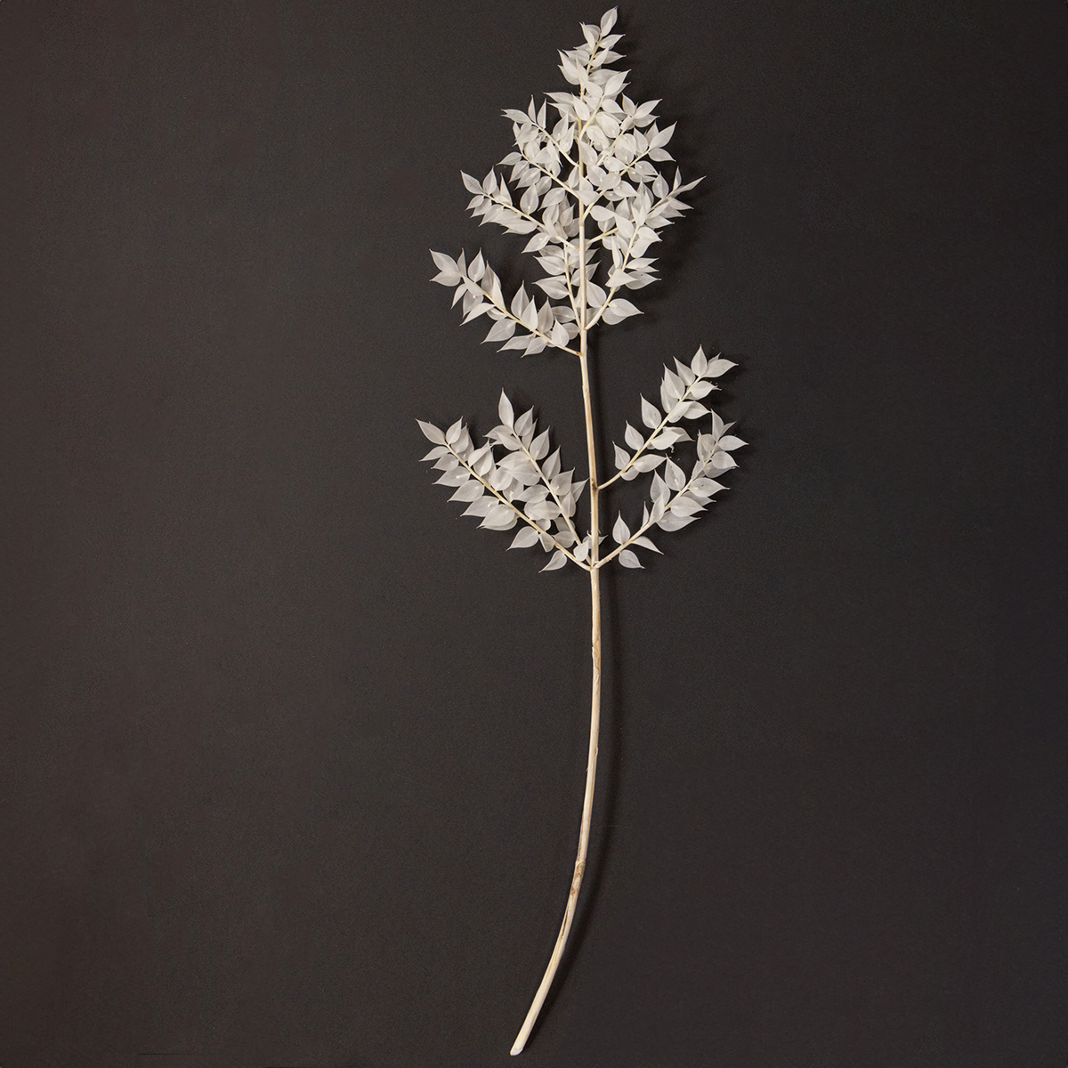 Der gebleichte Ruscus lässt sich durch den hellen Cremeton kontrastreich zu Trockenpflanzen, Dekozweigen und Exoten in Rot, Schwarz, Grün oder Pink einsetzen, wozu er dezenter wirkt als reinweiße Dekozweige.