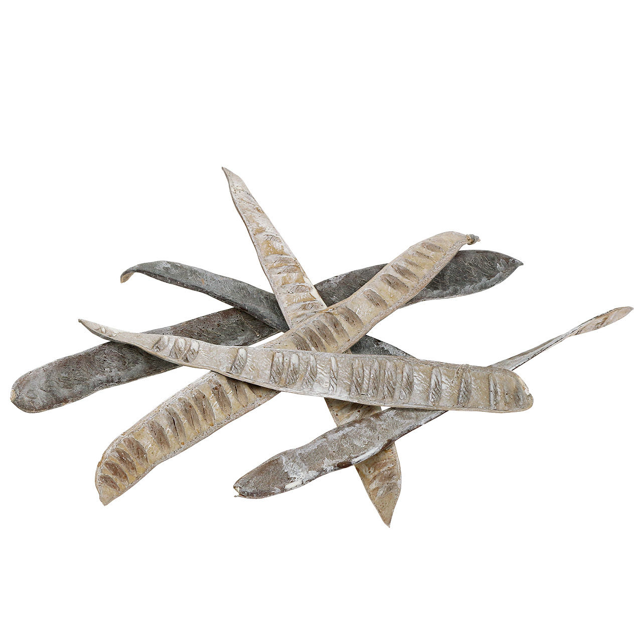 Die Scalettaschote in Weiß besteht komplett aus getrocknetem und gefärbtem Holz. Sie wird im Set zu je 25 Stück ausgeliefert. Die Länge der Exemplare variiert zwischen circa 28 Zentimetern und circa 40 Zentimetern. In der Breite misst jede Schote etwa 4 Zentimeter.
