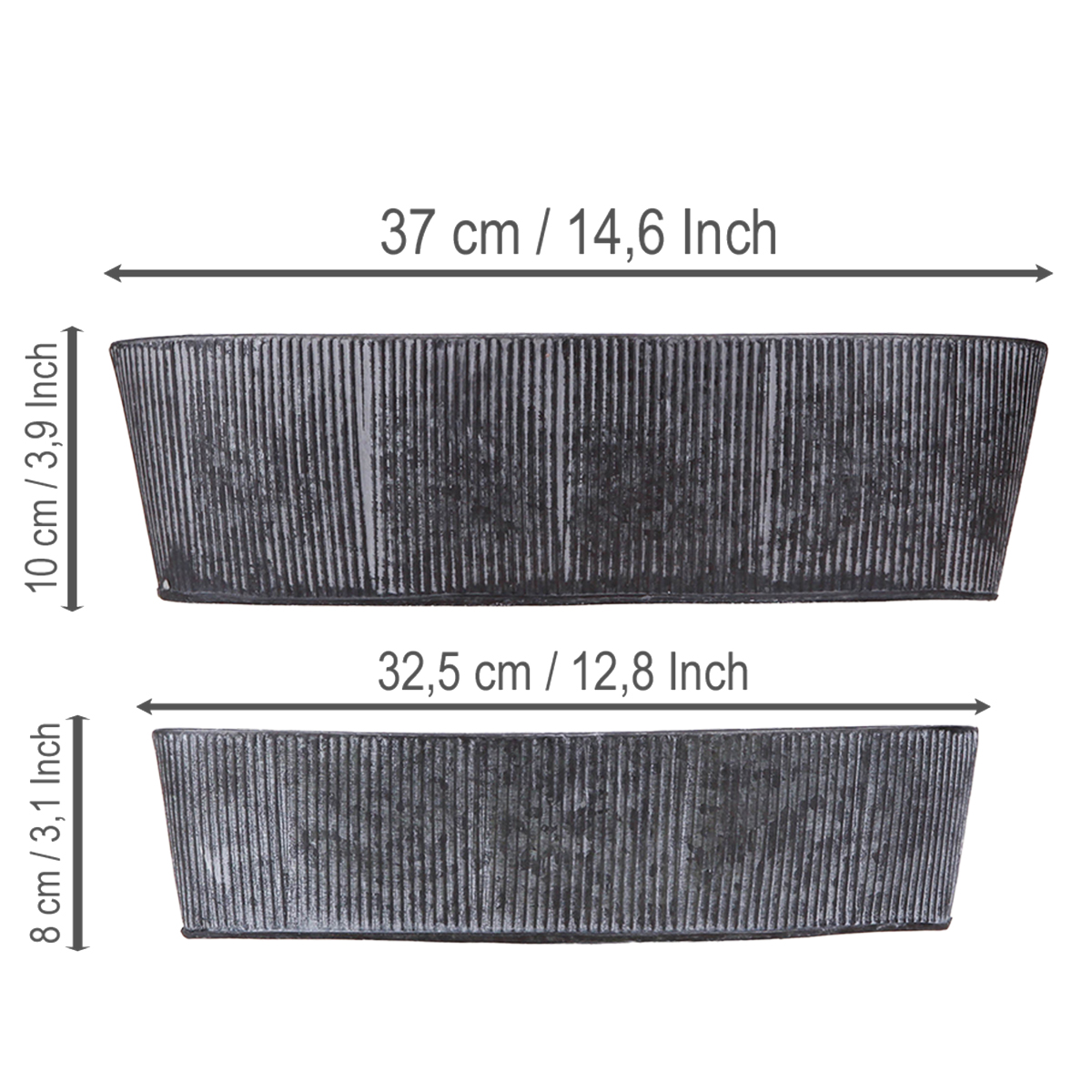 Die Schale in oval aus Metall und in Schwarz vereint stilvolle Eleganz mit einer charmanten Vintage-Ästhetik, die Ihr Zuhause veredelt. Ob als auffällige Dekoschale, als nostalgisch anmutende Tischdeko oder als rustikale Blumenschale – dieses Set aus zwei ineinander stapelbaren Metallschalen eröffnet zahlreiche kreative Möglichkeiten. Die edle Farbgebung in Schwarz, grau gewaschen, sowie das feine Rillendesign harmonieren perfekt mit jeder Einrichtung im Shabby-Chic oder Industrial-Stil. Nutzen Sie die Schalen als Pflanzschale und setzen Sie ein grünes Highlight mit Zimmerpflanzen oder Kräutern. Die Kleinere eignet sich hervorragend als stilvolle Schlüsselaufbewahrung oder für Sukkulenten.
