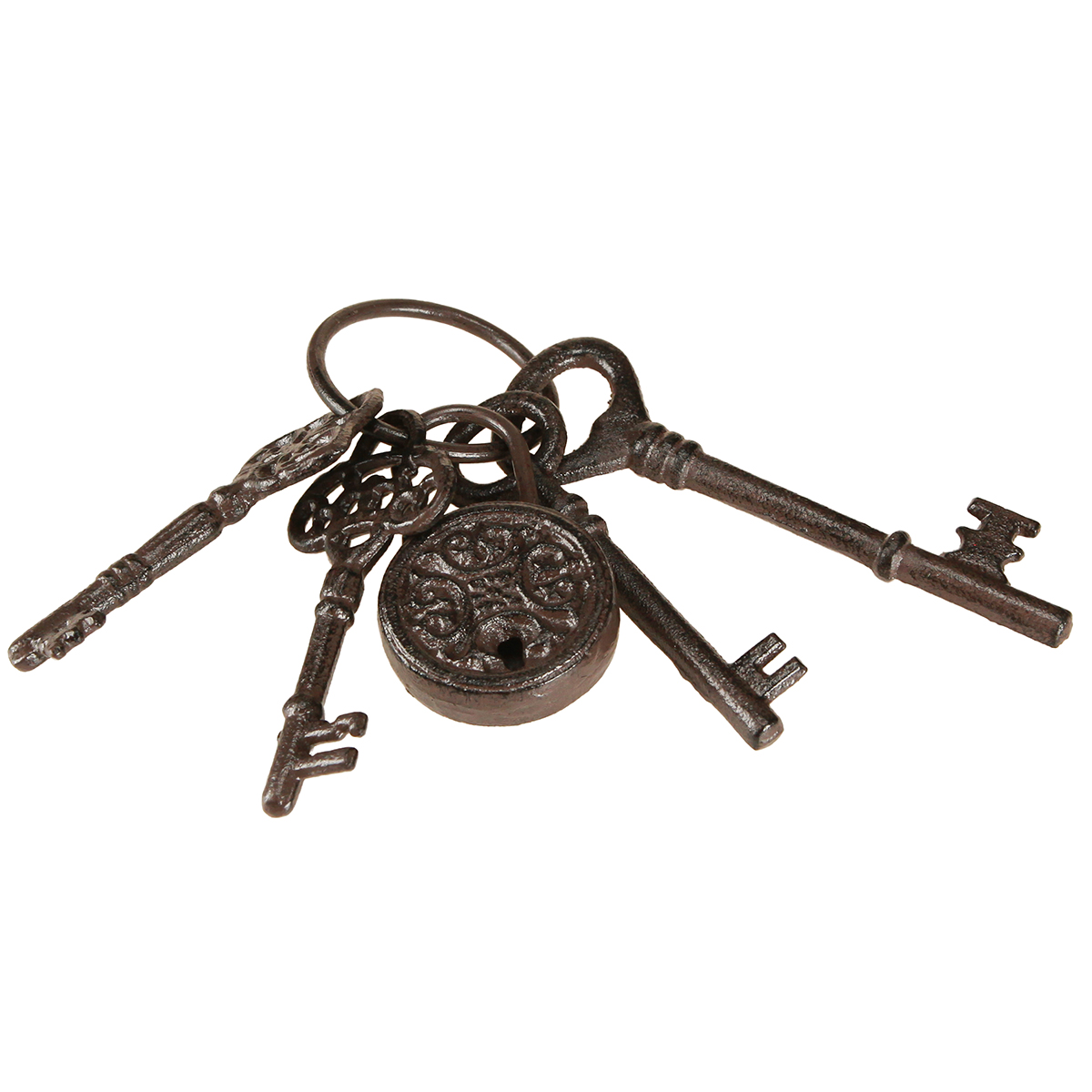 Der Schlüsselbund mit Metallring in Braun hat eine Gesamtlänge von circa 22 Zentimetern, während der Ring einen Durchmesser von ungefähr 7 Zentimetern besitzt. Die vier Schlüssel, die zum Deko-Set gehören, sind unterschiedlich groß und haben eine Länge zwischen 12 und 17 Zentimetern. Das Schloss stellt bei dieser Metall-Deko die Breite, die etwa 6 Zentimeter beträgt.