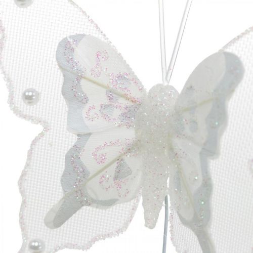 Schmetterlinge mit Perlen und Glimmer, Hochzeitsdeko, Federschmetterling am Draht Weiß