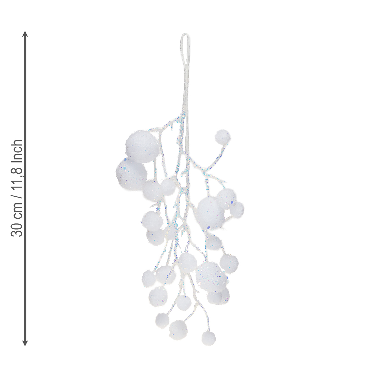 Die weiße Schneeflocken-Deko mit irisierendem Glitzer ist etwa 30 Zentimeter lang. Der Durchmesser der Schneebälle beträgt etwa 1,5 - 3 Zentimeter.