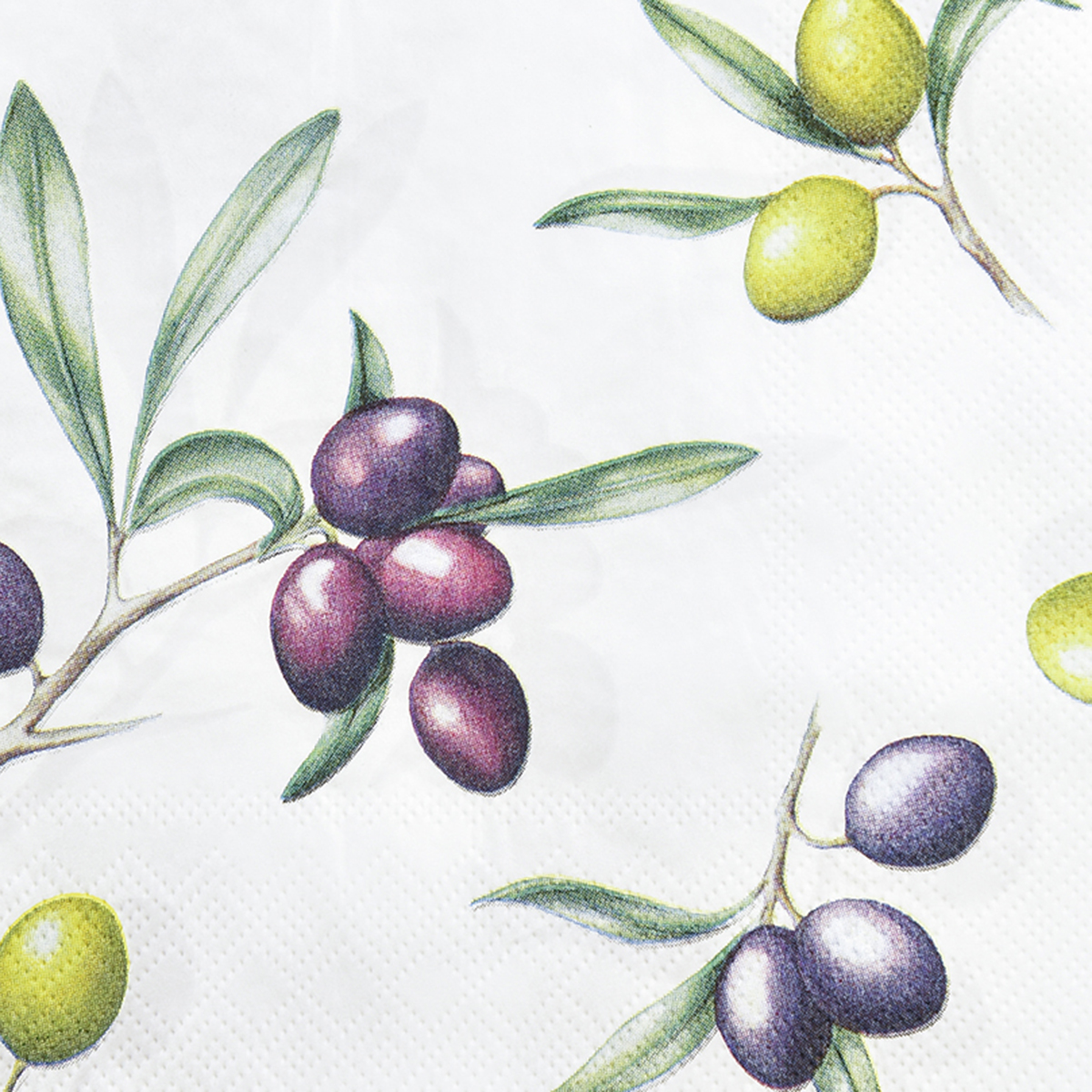 Die Oliven hängen an Zweigen und drumherum sprießen grüne Olivenblätter. Das Motiv lädt geradezu dazu ein, zu Tisch zu kommen!