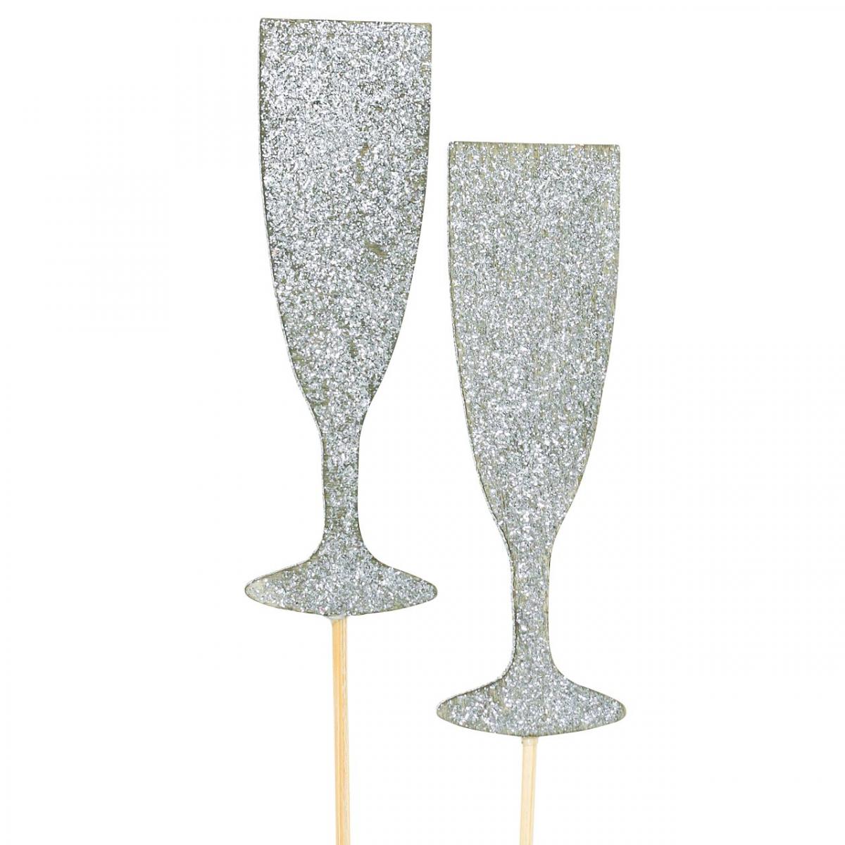 Die Blumenstecker haben den Umriss eines Sektglases. Das Sektglas ist mit einer silbern funkelnden Farbe und Glitter überzogen.