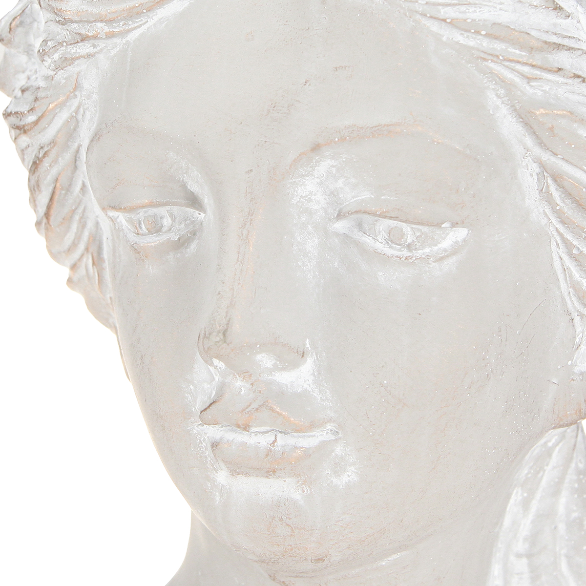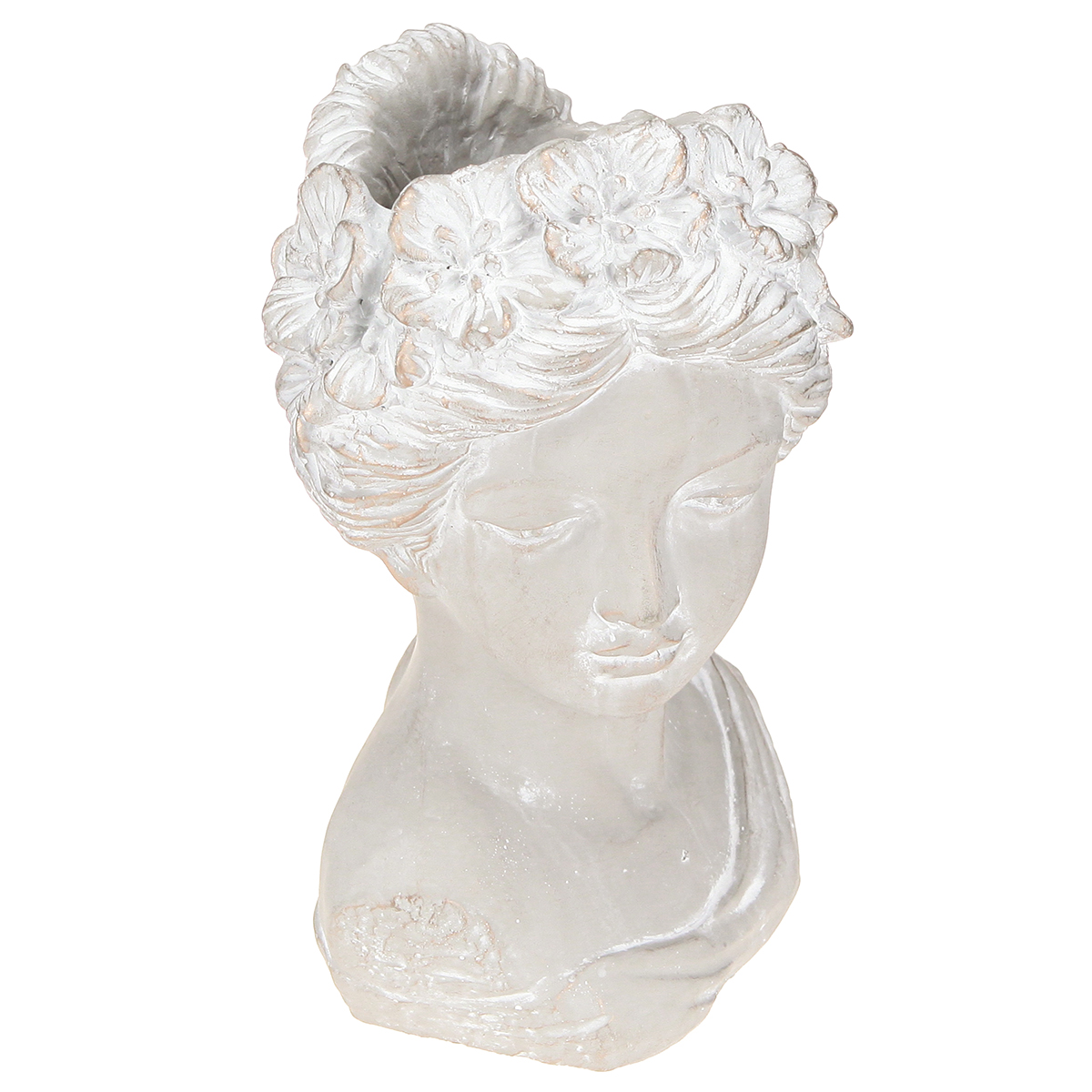 Entdecken Sie die zeitlose Eleganz dieser unvergleichlichen Skulptur! Die Frauenbüste aus Steinguss präsentiert sich als Übertopf in Grau, der jedem Raum ein charmantes, antikes Flair verleiht. Diese detailreiche Steinguss-Figur, die sich durch das edle Grau mit teils geweißten Elementen und goldenen Akzenten auszeichnet, ist nicht nur ein stilvoller Hingucker, sondern auch ein vielseitiger Übertopf. Die detailreiche Darstellung einer Frau mit Blumenkranz im Haar unterstreicht die klassische Ästhetik dieser Skulptur und macht sie zu einem perfekten Deko-Element für Liebhaber der Stilrichtungen Shabby-Chic oder klassisch. Der robuste und schwere Steinguss sorgt für einen sicheren Stand, während die vier Schaumstoff-Schoner auf der Unterseite empfindliche Oberflächen schützen. Ideal für die Dekoration im Wohnzimmer, Büro oder Garten, schafft diese Skulptur mühelos ein mediterranes Ambiente.