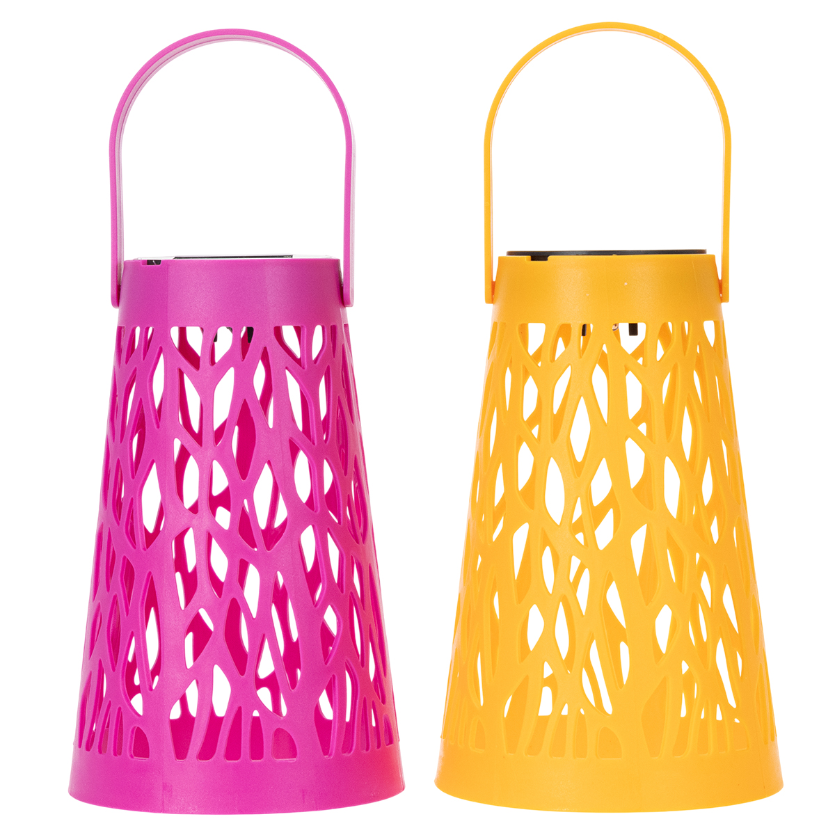 Das Set aus zwei Laternen – jeweils in fröhlichem Pink und leuchtendem Gelb – bringt Farbe in Ihre Außenbereiche. Der moderne Look der LED-Laternen aus durchbrochenem Kunststoff in filigraner Optik passt perfekt zum sommerlichen Flair und lässt sich mit fast jedem Gartenstil kombinieren. Die warmweiße Lichtfarbe der LEDs zaubert ein sanftes, einladendes Leuchten, ohne zu blenden, und macht diese Leuchten zu einem vielseitigen Lieblingsstück für Ihre Outdoor-Dekoration. Entdecken Sie, wie einfach es sein kann, Ihren Garten zum Strahlen zu bringen!