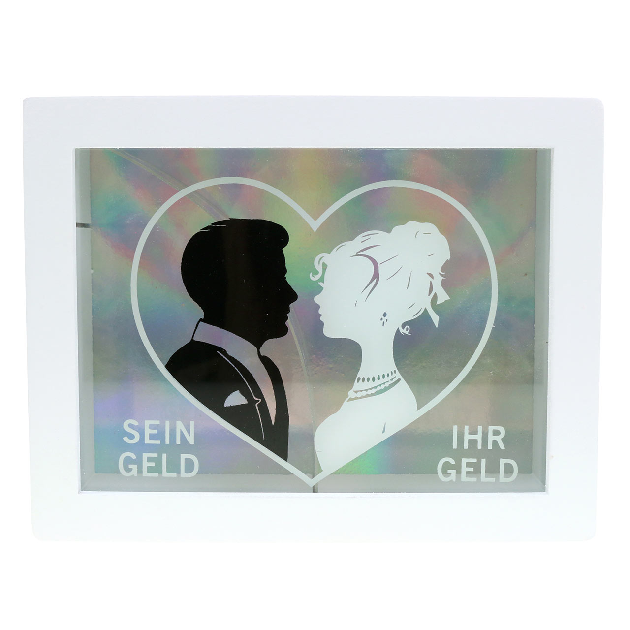 Die Geldkiste ist weiß bemalt und hat eine Rückwand aus Sperrholz die mittels 4 Klemmen leicht geöffnet und geschlossen werden kann. Auf der Glasfront ist ein Herz aufgedruckt. Eine männliche Figur in der Farbe Schwarz schaut dabei eine in der Farbe Weiß gehaltene Frau an. Der Aufdruck wird durch die Schriftzüge "Sein Geld" und "Ihr Geld" komplettiert. Im Inneren dieses ausgefallenen Geschenks zur Hochzeit oder zum Valentinstag befindet sich eine Trennwand aus Plexiglas. Diese leitet das gesamte Geld auf die Seite der Frau um ("Ihr Geld").