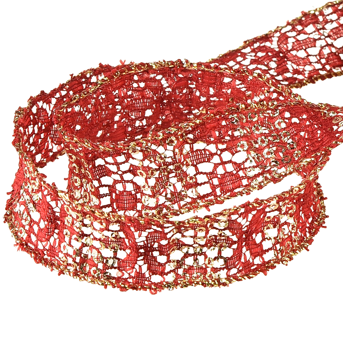 Entdecken Sie das funkelnde Spitzenband in Rot und Gold für festliche Dekorationen