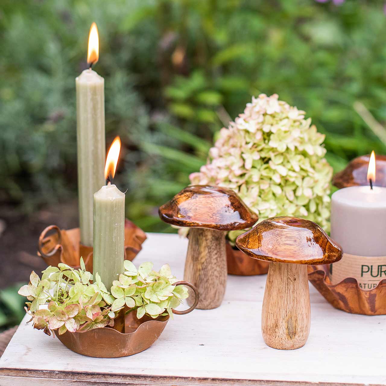 Von Holz bis Gold, von Rosa und Rot bis zu Gelb und Blau – für ganz viele Farbtöne halten Sie mit den kleinen Deko-Kerzen in freundlichem Olivgrün ein tolles Accessoire bereit, um Ihre Dekorationen stimmig zu krönen. Wie wäre es zum Beispiel im Sommer mit einer Schale aus Birkenrinde, die Sie mit Kräutern und silbernen Kerzenhaltern dekorieren? Die grünen Stabkerzen runden Ihre Naturdeko dann stimmig ab!
