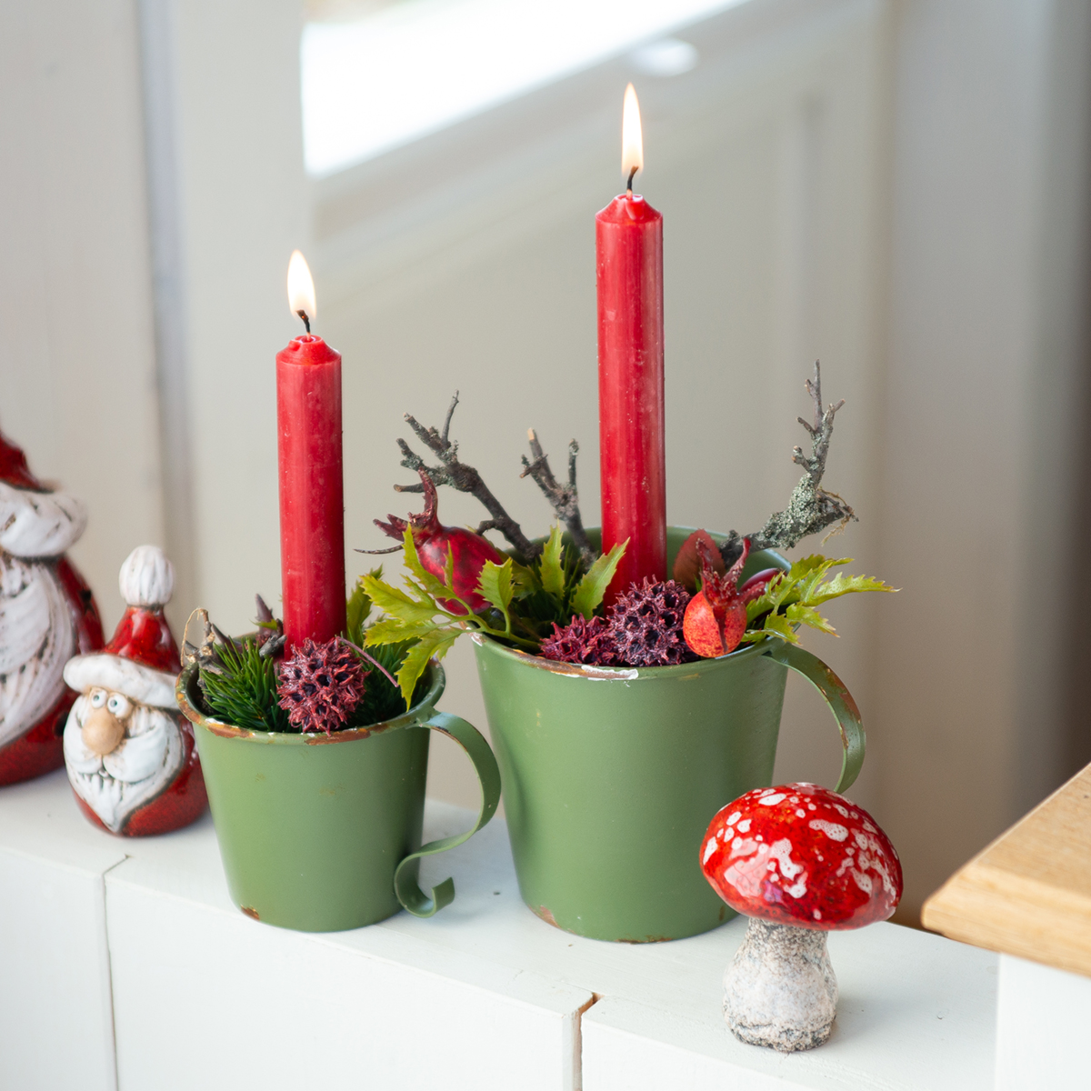 Unser grüner Stabkerzenhalter ist nicht nur ein Blickfang für Ihre festliche Tischdekoration, sondern eignet sich auch hervorragend als stimmungsvolle Kerzendeko auf der Fensterbank oder als Dekoration für Kaminsims oder Konsole. Dieser elegante Kerzenhalter in Tassenform ist aus hochwertigem Metall gefertigt und besticht durch seine Langlebigkeit und sein Vintage-Design in einem charmanten Grünton. Unter ausdrucksvollen Abnutzungsspuren scheint der Kerzenhalter pittoresk zu rosten.