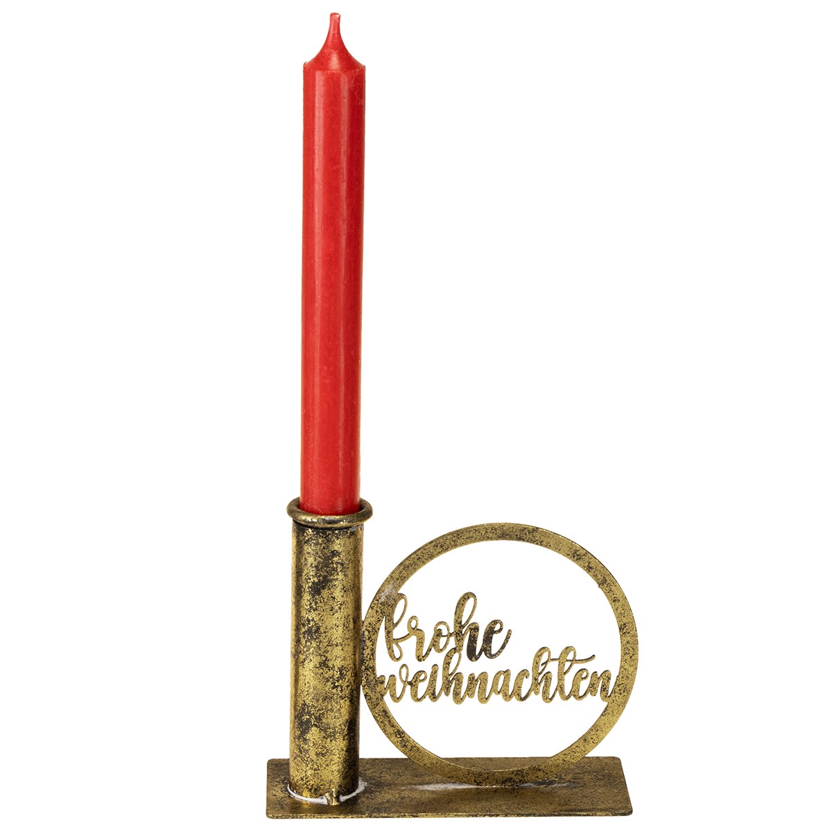 Entdecken Sie unseren Stabkerzenhalter für Weihnachten im edlen antik-golden Weihnachts-Design - eine stilvolle Ergänzung für Ihre Festtagsdekoration. Mit seinem stimmungsvollen Schriftzug „Frohe Weihnachten“ und der aufwändigen Antik-Optik mit schwarzen Akzenten sorgt dieser Kerzenständer in Gold mit seinem Antik-Look für eine warme, heimelige Atmosphäre in jedem Raum.