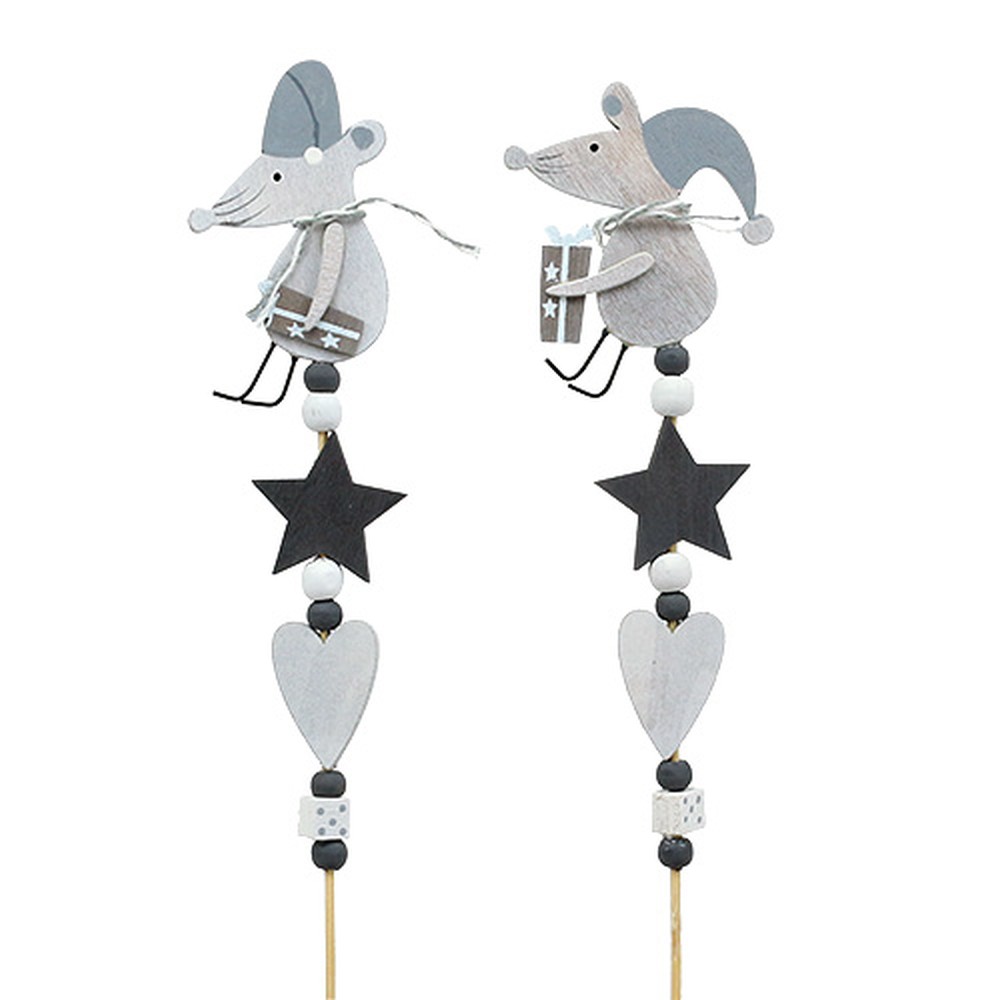 Süße Mäuse mit Zipfelmütze – wo gibt´s denn sowas? Bei Floristik24 natürlich! Dieser dekorative Holzstecker hat jeweils eine Maus in Grau auf seiner Spitze sitzen, die eine Weihnachtsmütze trägt und einmal ganz freudig ein Geschenkpaket trägt und einmal das Paket ganz lässig unter einem Arm hält und schlendert. Darüber hinaus tragen beide Varianten einen weiß-grauen Faden als Schal und besitzen kleine Beine aus schwarzem Metall. Unter den Weihnachtsfiguren befinden sich noch mehrere Holzperlen in Grau und Weiß sowie ein Herz, ein Weihnachtsstern und ein Würfel.Der untere Teil des Stabes ist komplett von Deko befreit, sodass Sie das Ganze sehr einfach in die Erde von Ihren Topfblumen stecken können. So können Sie selbst Ihre Pflanzen zur Adventszeit mit Weihnachtsdeko verzieren. Auch können Sie die Holzstecker in einem Blumenstrauß und in die Schleife eines Geschenkpaketes einarbeiten.