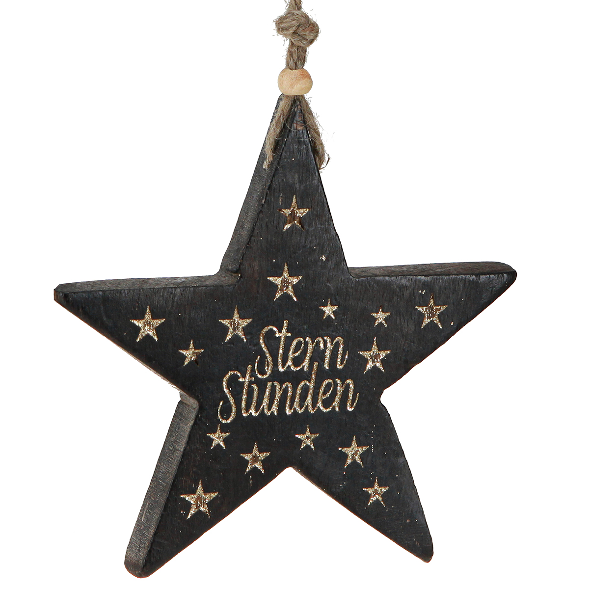 Diese Sternen-Anhänger aus Holz sind eine wunderschöne Ergänzung für Ihre Weihnachtsbaum-Dekoration. Der schwarze Holzstern mit goldener Prägung "Sternstunden" und goldenen Sternen strahlt Eleganz und Festlichkeit aus. Die Rückseite ist schlicht in Schwarz gehalten, und der Aufhänger aus Jute mit Holzperle unterstreicht die Natürlichkeit des Materials.