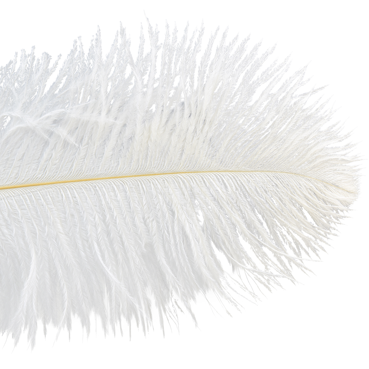 Mit Sorgfalt ausgesucht und vorsichtig gereinigt, sind die blütenweißen Straußenfedern für die Deko bestimmt. Die cremefarbenen Kiele, die weite Silhouette und die Größe dieser Federn beeindrucken dabei gleichermaßen.