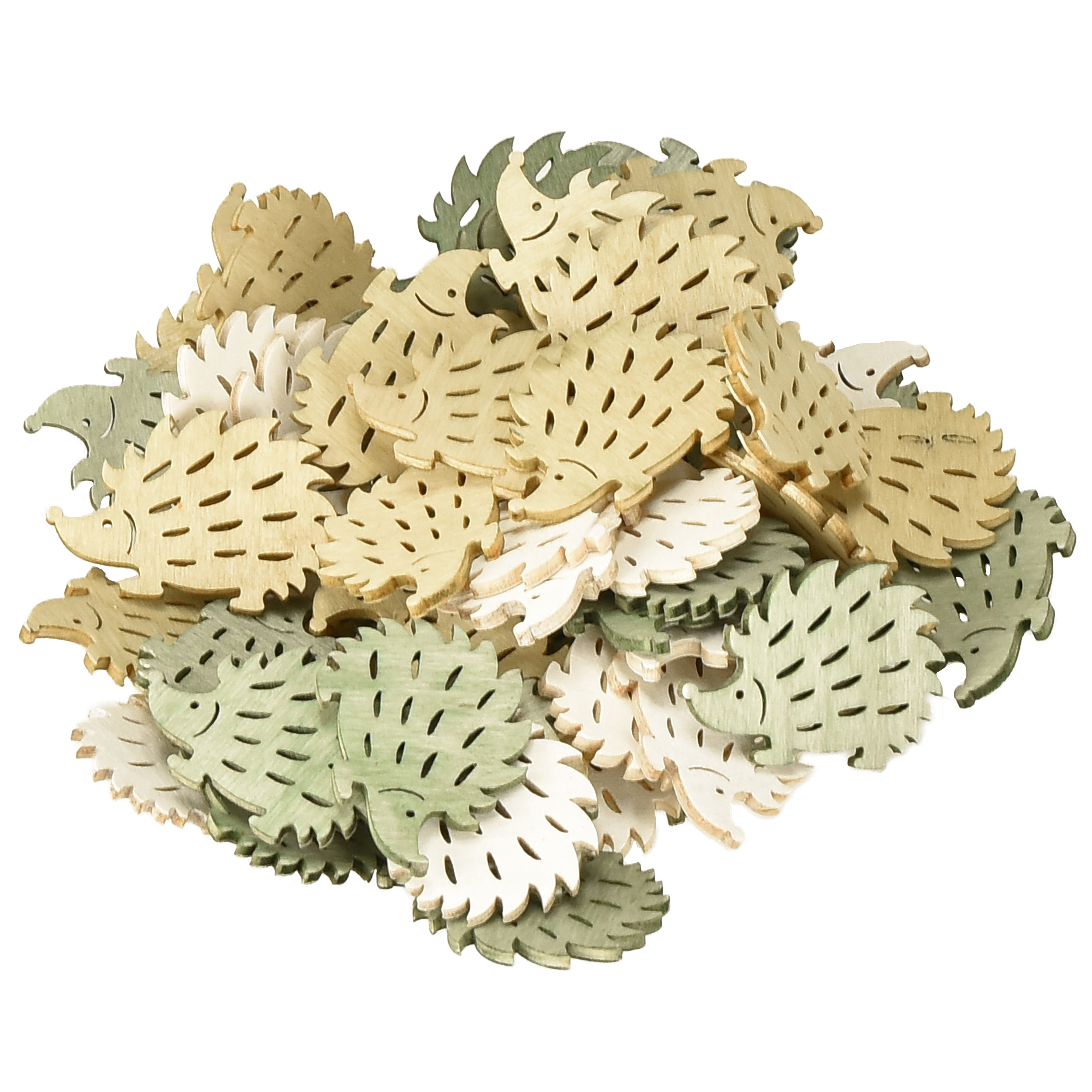 In Grün, Weiß und einem freundlichen hellen Braunton sind die kleinen Streuteile gefertigt. Schmale, kurze Spalten deuten das Stachel-Kleid ein, während die Ränder der Holz-Deko deutlich die Konturen eines Igels nachzeichnen.