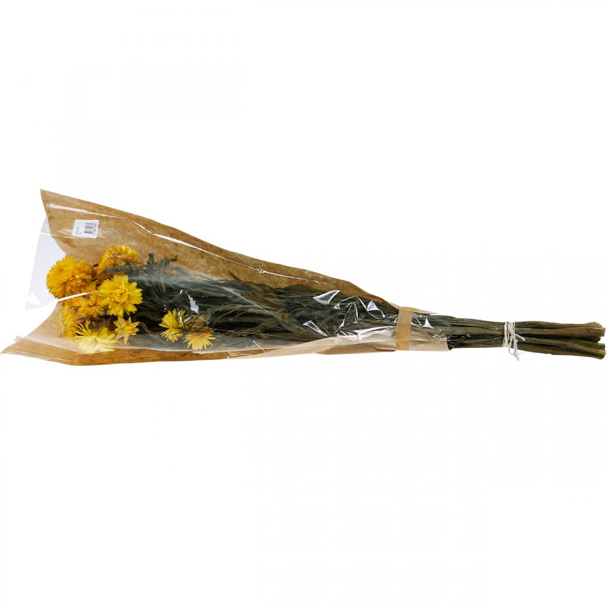 Die Strohblume in Gelb ist ein getrocknetes Naturprodukt. Diese Trockenblumen-Deko im Bund begeistert durch kräftige Farben und große, dichte Blüten. Bei diesem Strauß lässt sich die Trockenfloristik nur beim Blick auf die sorgfältig konservierten Blätter noch von lebenden Blumen unterscheiden. Kein Wunder, dass der Trend zur Trockendeko weiter aufblüht!In einer Tischvase wird der gelbe Strohblumen-Bund, botanisch unter der Bezeichnung Helichrysum bekannt, als Trockenstrauß zur nachhaltigen Augenweide. Das Naturprodukt ist bis zu ein Jahr haltbar und benötigt weder Wasser noch Pflege.