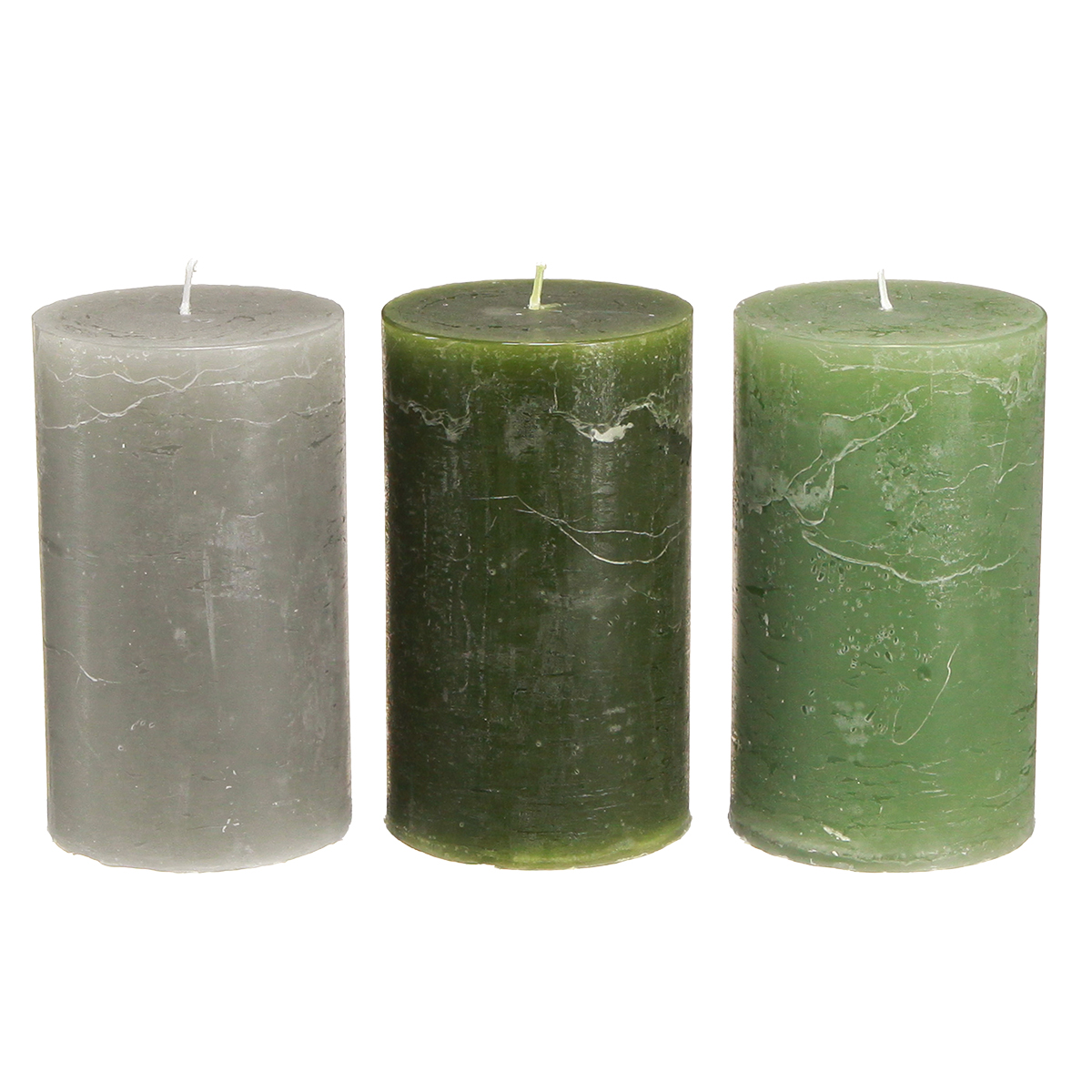 Produktname: Stumpenkerzen Set 3 Farben Grün, Durchgefärbte Kerzen, Tischdekoration, 70x120mm, 12Stück