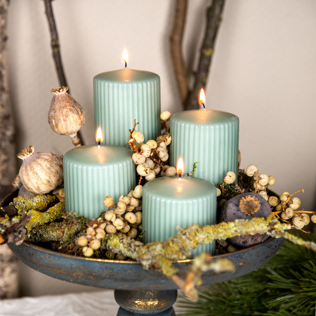 Durch die abgerundeten Rillen wirken die smaragdgrünen Kerzen besonders exklusiv und begeistern nicht nur als Adventskerzen. Die grünen Stumpenkerzen sind nicht durchgefärbt.