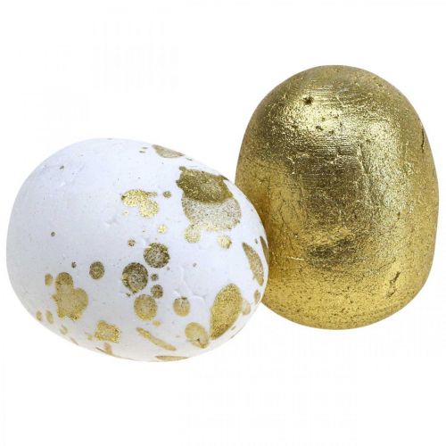 Sie erhalten die Styropor-Ostereier sortiert nach Farbe: Die Hälfte der Eier ist golden, die andere Hälfte weiß mit goldenen Sprenkeln.