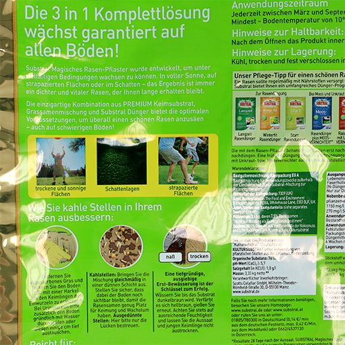 Ärgern Sie sich auch über kahle Stellen oder Lücken in Ihrem Rasen? Dann wird Sie Substral® Magisches Rasenpflaster erfreuen! Dank der 3 in 1 Komplettlösung, die aus Rasensamenmischung, Rasendünger und Premium Keimsubstrat besteht, wirkt dieses Rasen-Pflaster unter den verschiedensten Bedingungen: Egal, ob auf strapazierten Flächen, auf denen Sie zum Beispiel Fußball spielen, auf trockenen und sonnigen Flächen oder in Schattenlagen – überall können Sie nun einen schönen, lückenlosen Rasen ansäen!