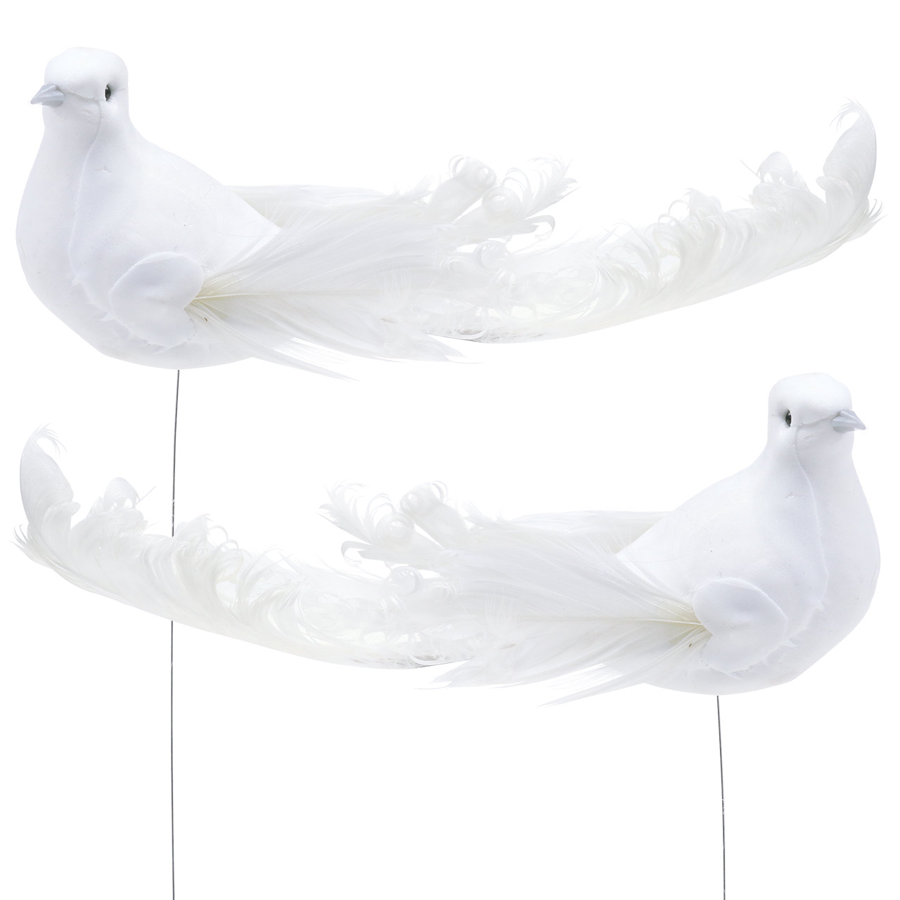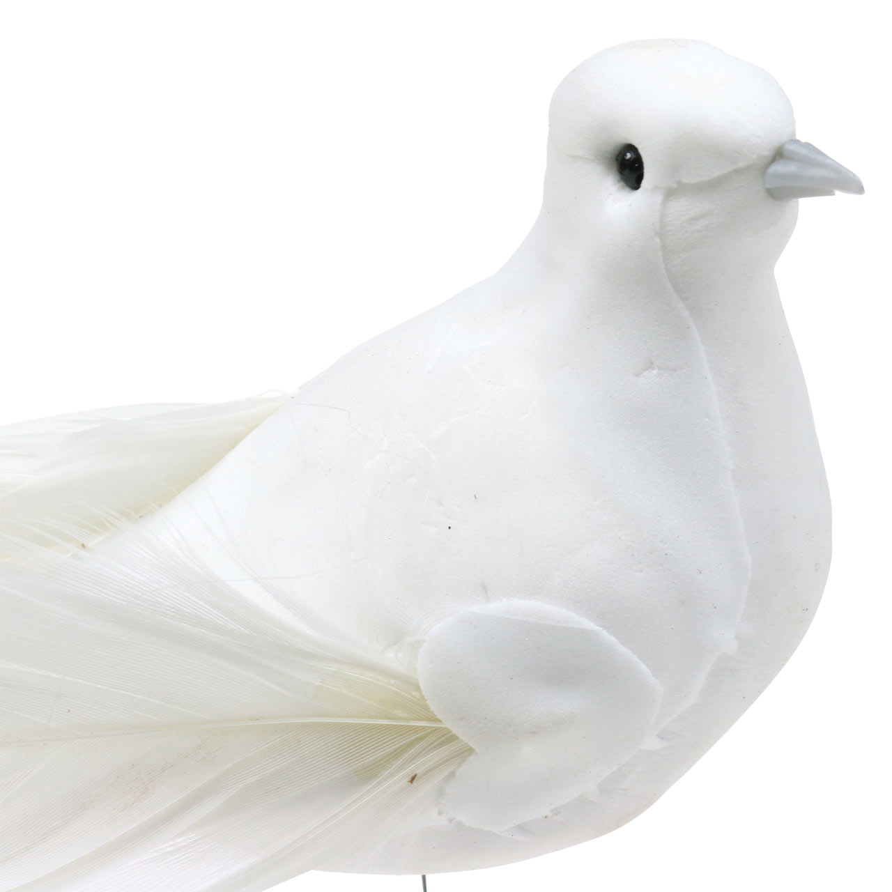 Die weißen Tauben sehen mit ihren süßen, schwarzen Knopfaugen und dem grauen Schnäbelchen so richtig putzig aus. Doch das eigentliche Highlight des strahlend weißen Vogels ist die gelockte, lange Schwanzfeder, die Ihrer Frühlingsdeko luftigen Schwung verleiht.