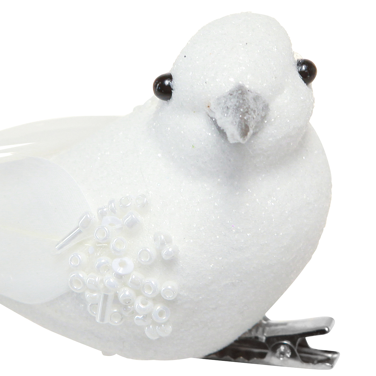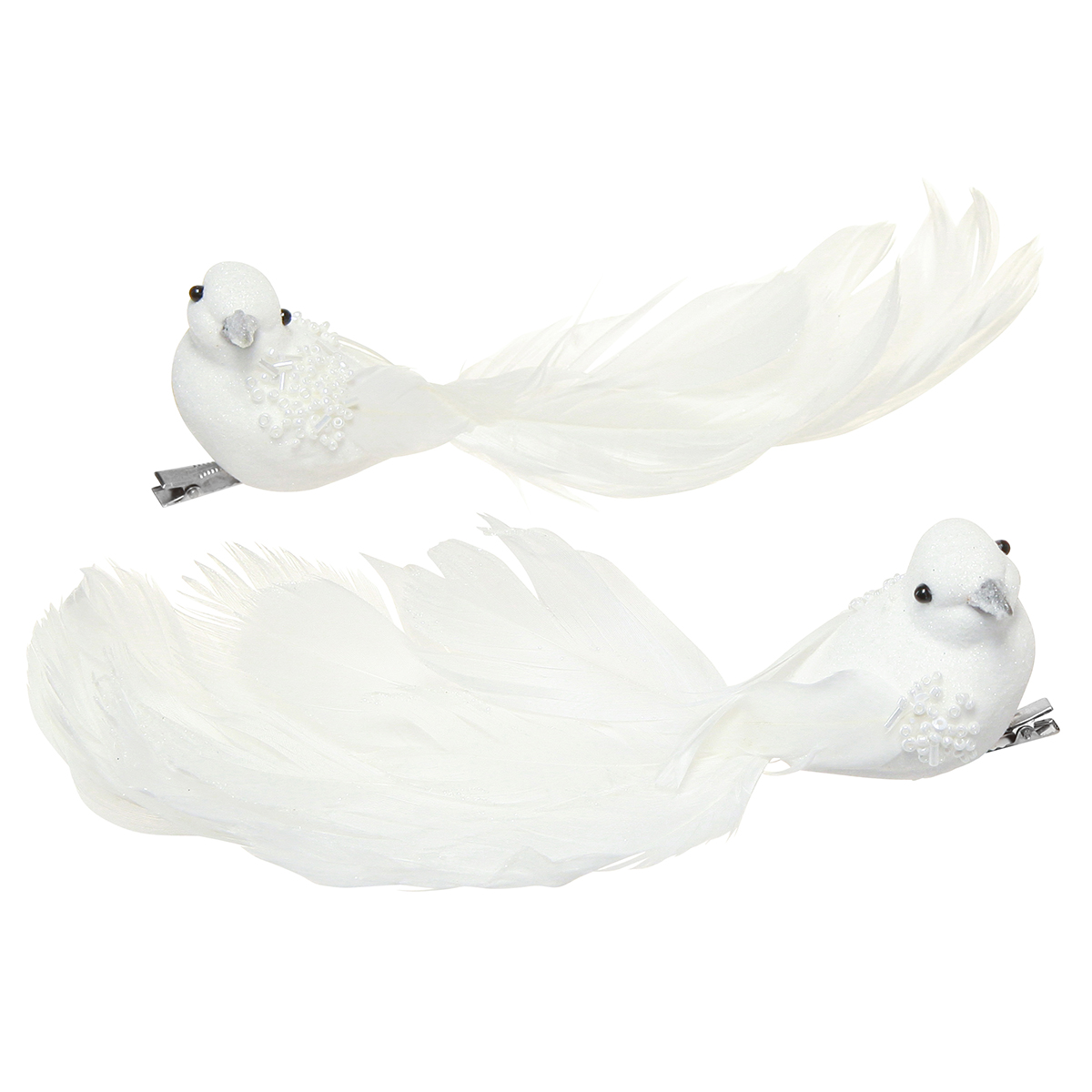 Das Taubenpaar am Clip besitzt eine Länge von etwa 22 Zentimetern und ein Höhe von circa 5 Zentimetern. Die Körper sind in einem eleganten Weiß gehalten, das zusätzlich noch durch silbernen Glitter, Perlen und Pailletten zum Funkeln gebracht wird. Die Schwanzfedern und die Flügel bestehen aus echten, weißen Federn, die zum Teil noch mit Glitter geschmückt sind.