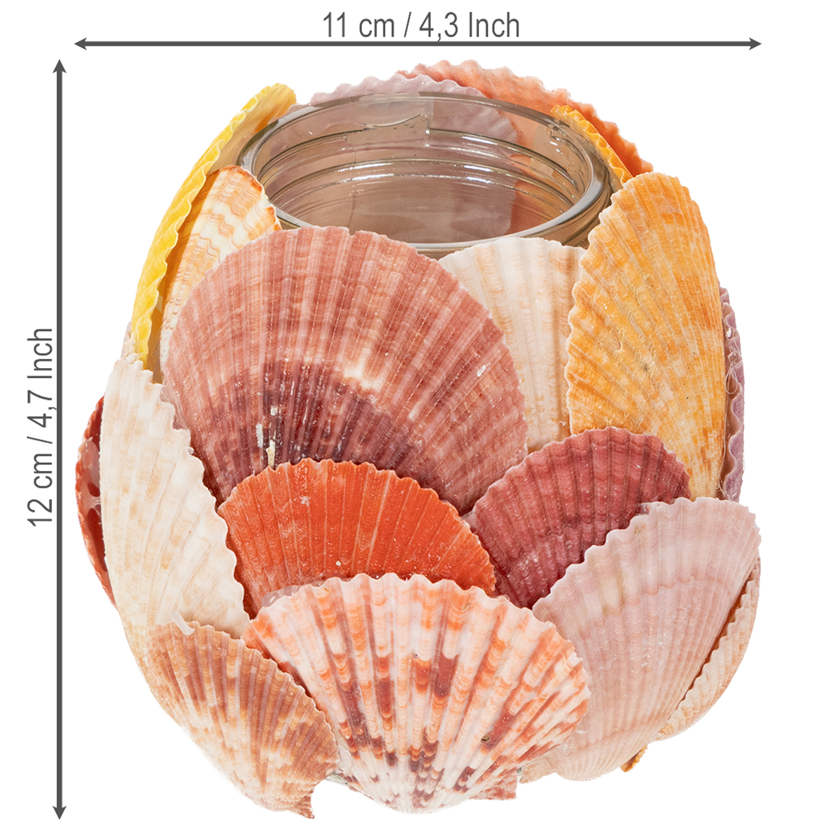 Mit einer Höhe von 12 Zentimetern, einem Durchmesser von 11 Zentimetern und seiner handlichen Form fügt sich der Teelichthalter ideal in unterschiedliche Dekorationsstile ein. Die natürlichen Farben der Muscheln harmonieren besonders schön mit Möbeln im Landhausstil oder maritimen Ambiente.
