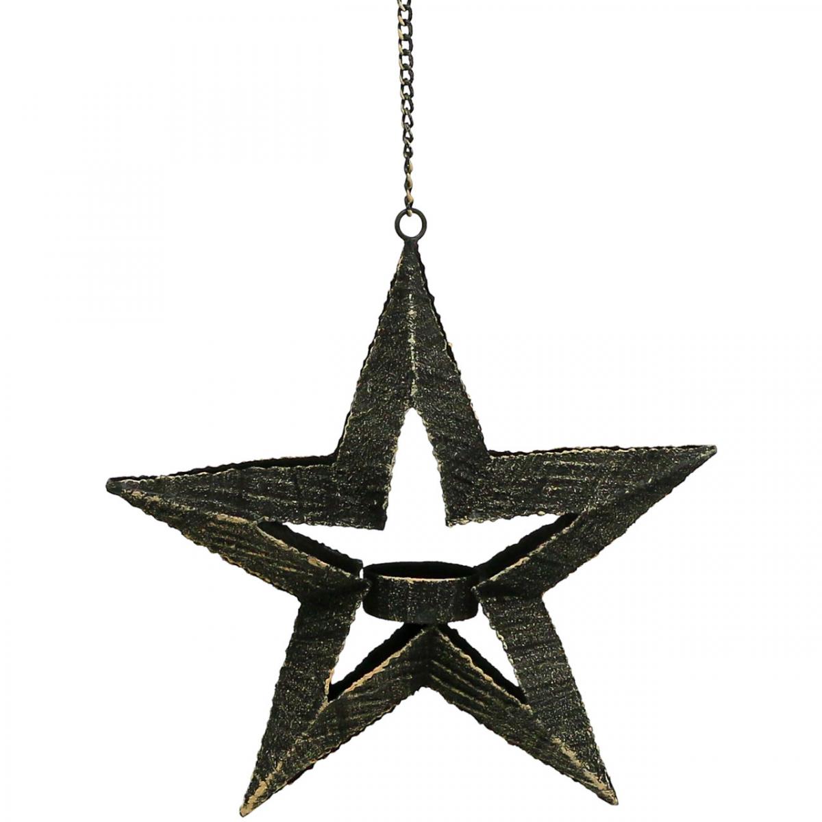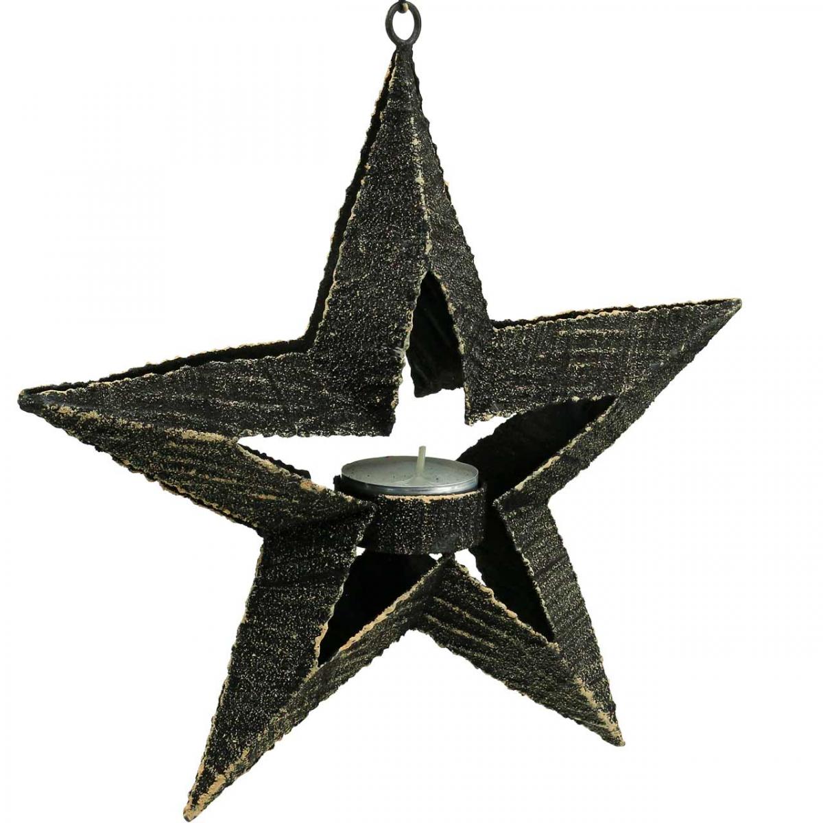Der bezaubernde Teelichthalter aus Metall besteht aus zwei zusammenhängenden Sternen. Diese zeigen in der Mitte eine ebenfalls sternförmige Aussparung. Dort sitzt auch die Halterung für ein Teelicht.