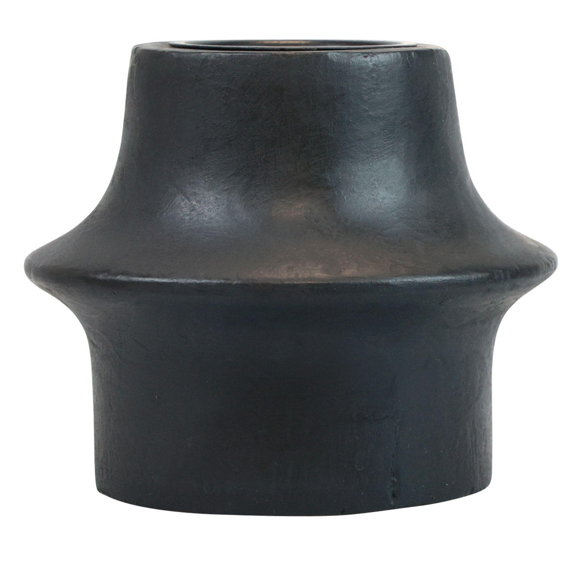 Von der Öffnung bis zur Mitte verläuft der schwarze Teelichthalter geschmeidig konisch, während der untere Teil gerade geformt ist. Dadurch ist die Mitte des Kerzenhalters die markanteste Stelle. Die geschwungene Form lässt schon etwas an asiatische Gefäße erinnern. Die schwarze Keramik und die runde Form des Teelichthalters haben ebenso nostalgischen Charme, sodass man sich den Kerzenhalter sehr gut in der Vintage-Deko vorstellen kann. Aber auch in ein modernes Ambiente mit Glas und Stein passt der Kerzenhalter aus Keramik wunderbar hinein.