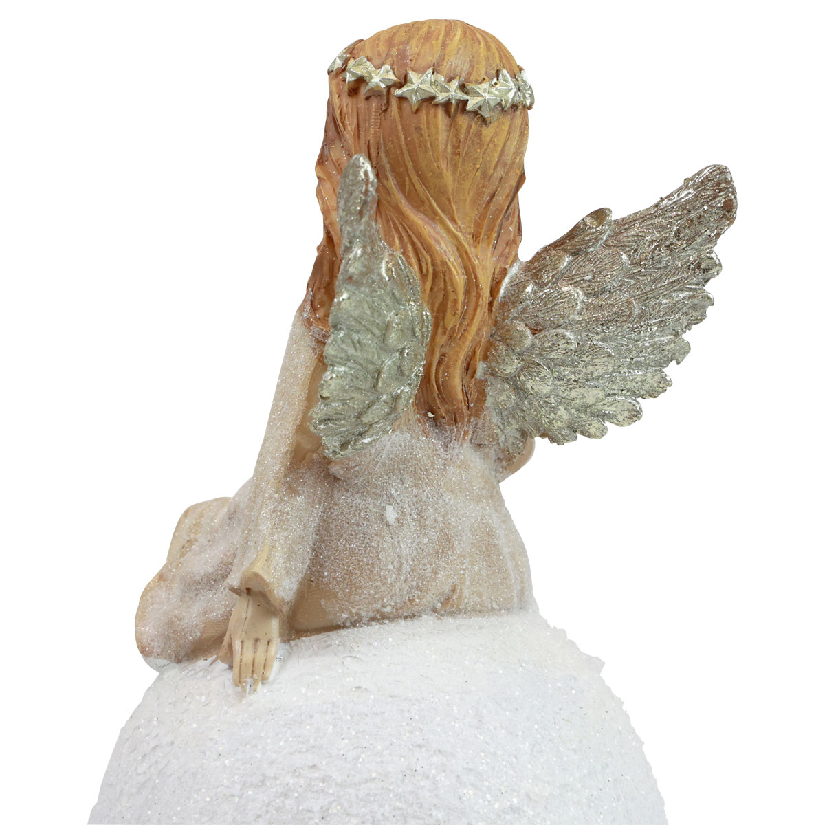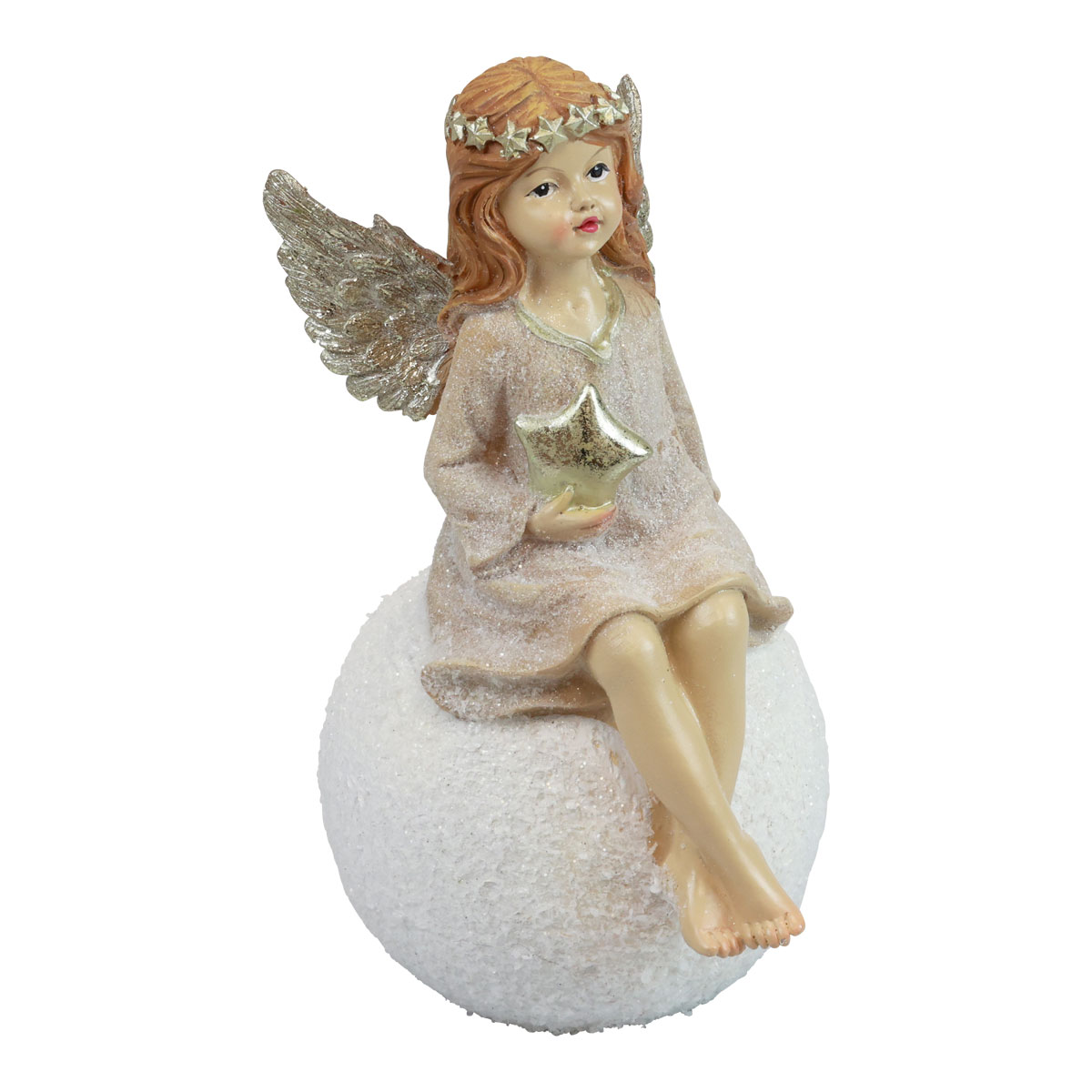 Dieser hübsche Engel mit Stern ist eine ganz bezaubernde Tischdeko zu Weihnachten! Der hübsche Weihnachtsengel sitzt auf einer weiß glitzernden Kugel, in Schneeball-Optik. Eine äußerst traumhafte Weihnachtsfigur für die Festtafel, das Regal oder für ihr Fensterbrett!Das Engelchen trägt ein frostig weiß funkelndes Kleid und sein brünettes Haupt schmückt ein Kranz aus Sternen in Golden. Einen großen güldenen Stern trägt der Engel vor der Brust in seiner rechten Hand. Gold schimmernde Flügel vervollständigen das typische Aussehen der Engel-Figur noch weiter.