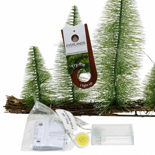 Der weihnachtliche Wald als Adventsdeko hat eine stattliche Gesamtlänge von circa 1 Meter; dabei ist die Basis lediglich etwa 5 Zentimeter breit. Insgesamt 60 warmweiße Micro-LED verteilen sich auf 18 teils größere, teils kleinere Bäumchen. Die Höhe der Tannen variiert dabei (ohne Aufsteller) zwischen ungefähr 16 und 27 Zentimetern. So erreicht die Deko mit dem Sockel insgesamt eine Gesamthöhe von 28,5 Zentimetern.