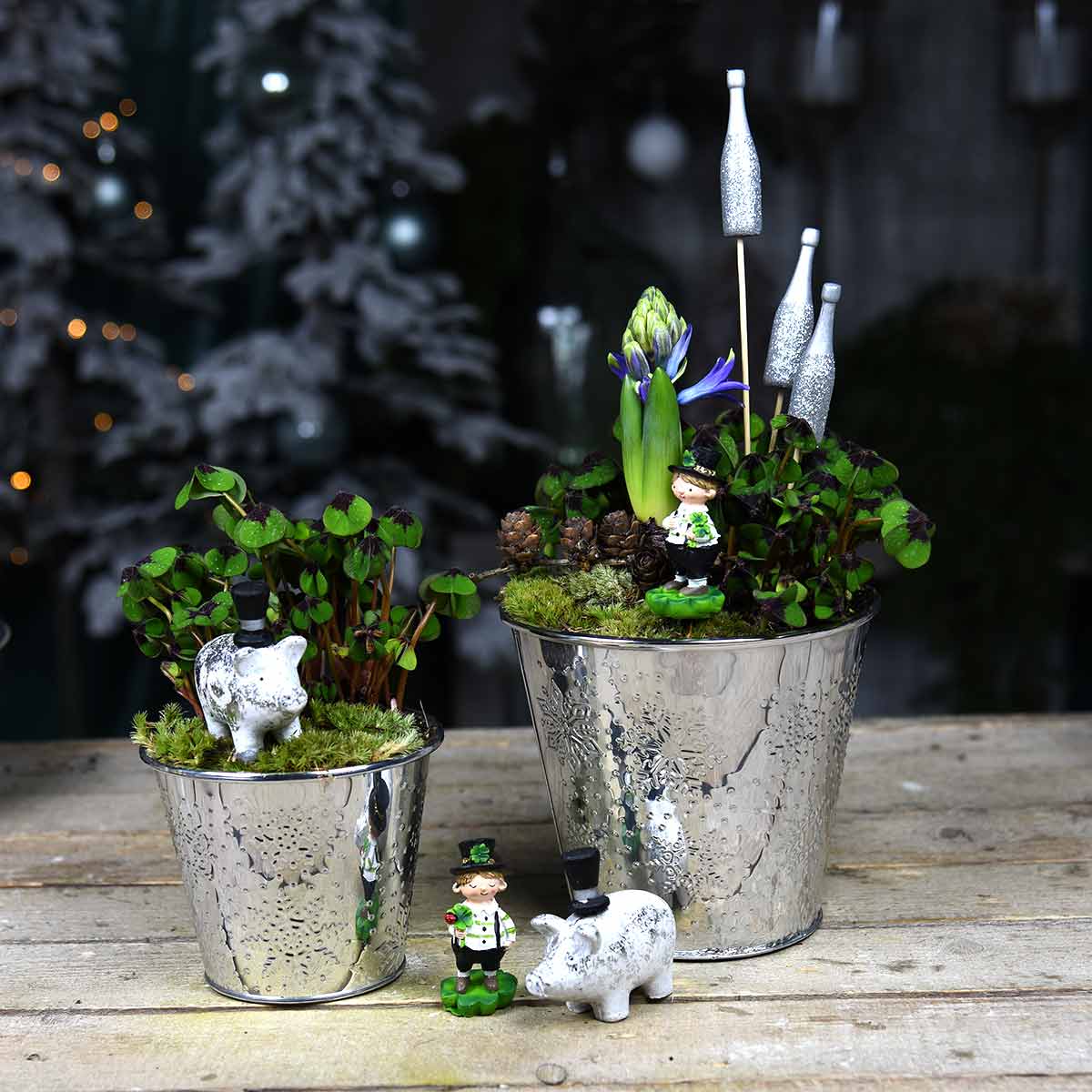 Wollen Sie das Deko-Gefäß bepflanzen, so ist zur Sicherheit der Gebrauch von Pflanzfolie empfehlenswert. Das gilt auch für den Fall, dass Sie auf der Basis von Nasssteckschaum ein festliches Adventsgesteck in dem Blechtopf anlegen wollen. Mit Tannenzweigen, Schmuckbändern und kleinen, glitzernden Deko-Anhängern wie Schneeflocken oder Schneemännern bestückt, können Sie den Blechtopf dann auch auf Ihre Ladentheke oder in ein Schaufenster stellen. Die Einsatzmöglichkeiten sind geradezu endlos!