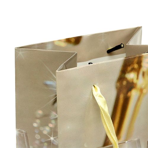 Die Geschenktüte ist aus stabiler Pappe gefertigt und besitzt einen zusätzlich verstärkten Boden. Die Höhe beträgt circa 35 Zentimeter, die Breite ungefähr 12 Zentimeter und die Tiefe etwa 9,5 Zentimeter. Der Henkel besteht aus zwei champagnerfarbenen Bändern.