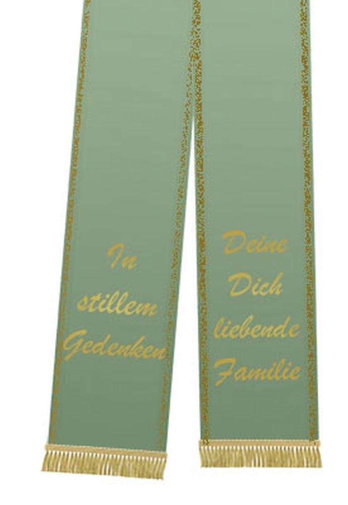 Das bedruckte Trauerband ist eine würdevolle Art, einen Verstorbenen zu verabschieden. Mit zwei Texten fertig bedruckt, passt das Schleifenband ideal zu Grabgestecken, Blumenkränzen und Blumengestecken zur Beerdigung oder auch zu einem Grabstrauß.Text1: In stillem Gedenken