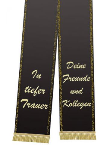 Das bedruckte Trauerband ist eine würdevolle Art, einen Verstorbenen zu verabschieden. Mit zwei Texten fertig bedruckt, passt das Schleifenband ideal zu Grabgestecken, Blumenkränzen und Blumengestecken zur Beerdigung oder auch zu einem Grabstrauß.Text1: In tiefer Trauer