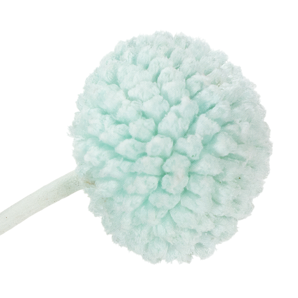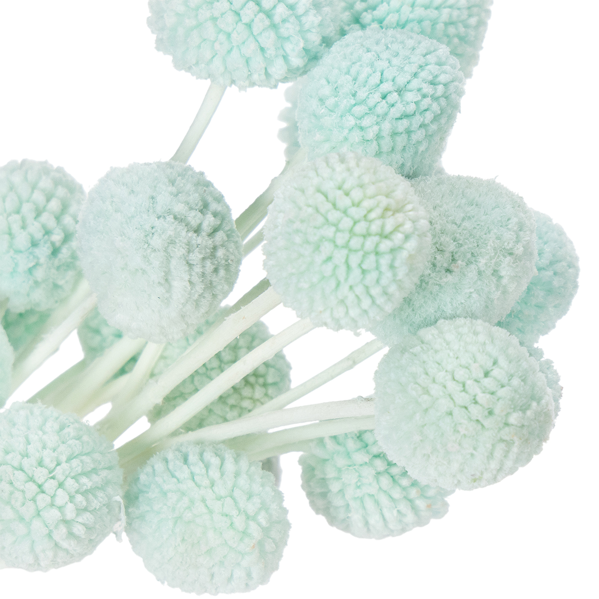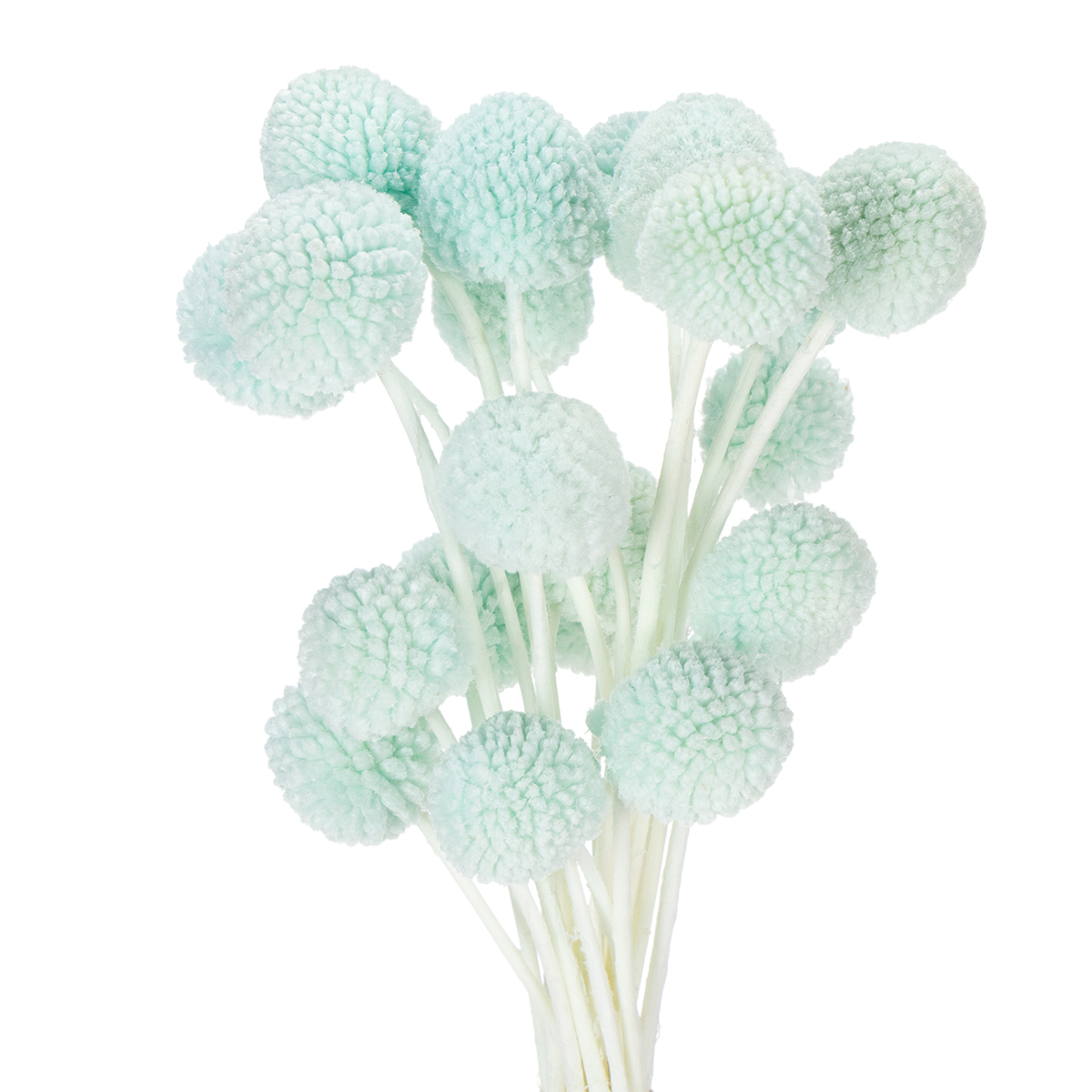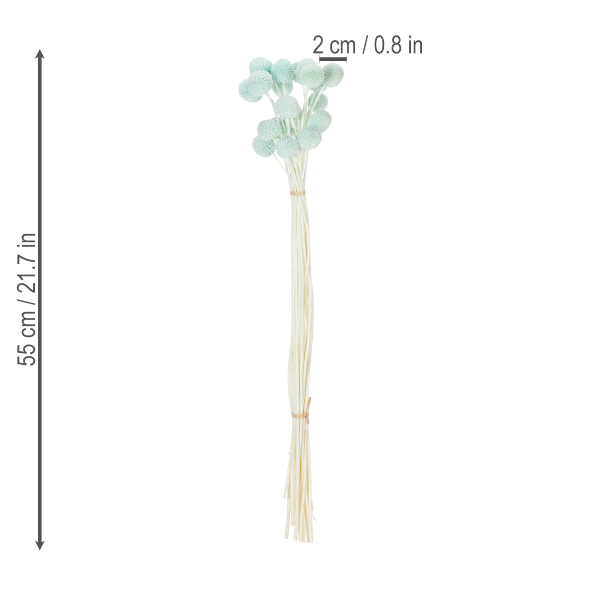 Die Köpfe der Craspedia haben einen Durchmesser von etwa zwei bis drei Zentimetern und machen den Strauß zu einem attraktiven Mittelpunkt. Die naturfarbenen Stiele schaffen dabei einen charmanten Kontrast zur leuchtenden Mintblau-Farbe. Besonders dekorativ wirkt der Strauß in minimalistisch gehaltenen Vasen oder als Ergänzung in einem größeren Arrangement mit anderen Trockenblumen dekorativ. Kombinieren Sie ihn zum Beispiel mit Pampasgras oder Eukalyptus für einen luftigen, modernen Look.