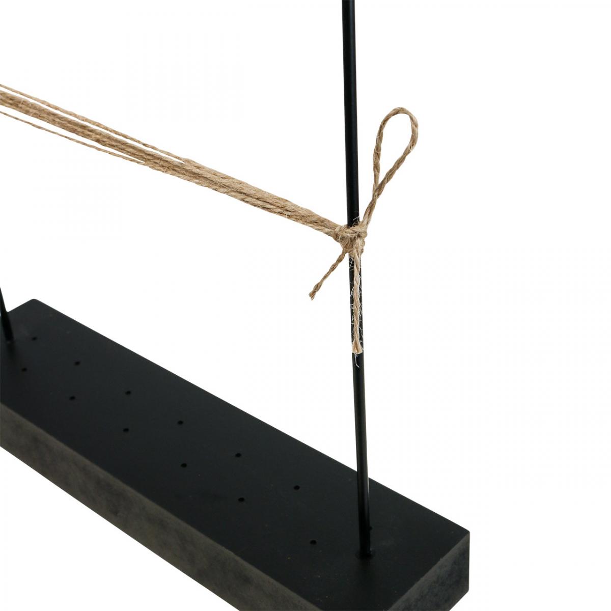 Flowerboard und Bogen sind in mattem Schwarz eingefärbt. Insgesamt 13 zickzackförmig im Wechsel angeordnete Stecklöcher sind in in der Blumenleiste für Trockenblumen vorgebohrt. Ein mehrfach waagerecht am Bogen gespanntes Juteband ermöglicht ein punktgenaues Arretieren der in den Leiste aus Holz eingesteckten Trockenfloristik.