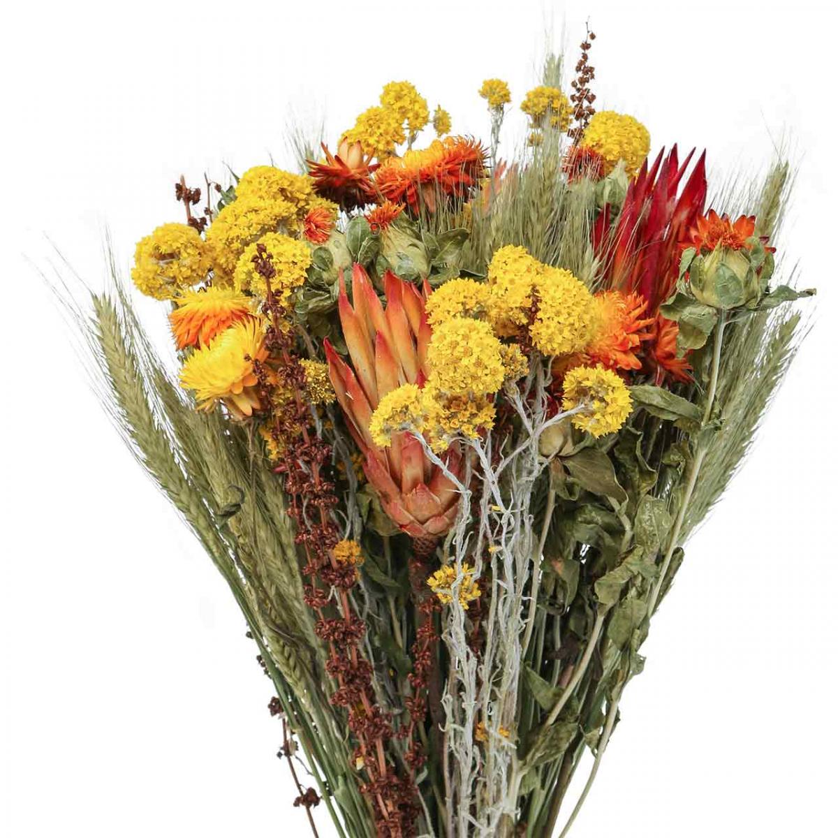 Dieser Trockenblumenstrauß stellt ein buntes Potpourri aus wilden Wiesenblumen und imposantem Getreide dar. In dem Strauß aus Wiesenblumen dominieren das strahlende Gelb und Orange der Blüten, das vom dezenten Hellgrün des Getreides im Kontrast verstärkt wird.In dieser optisch harmonierenden Auswahl an Trockenblumen finden sich Felsensteinkraut, Stängellose Gänsedistel, Saflor, Silberbaumgewächs und Weizen. Präsentieren Sie diesen wunderbaren Blumenstrauß in einer entsprechend edlen Vase.
