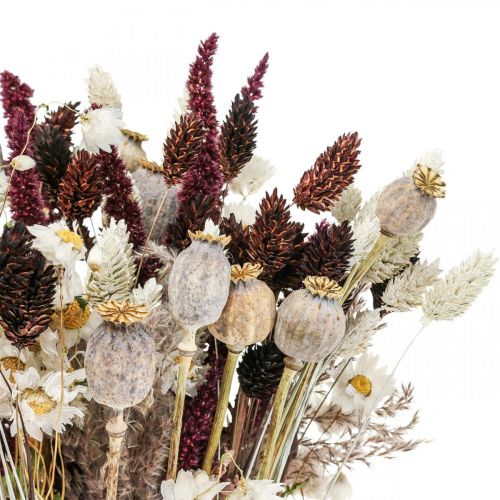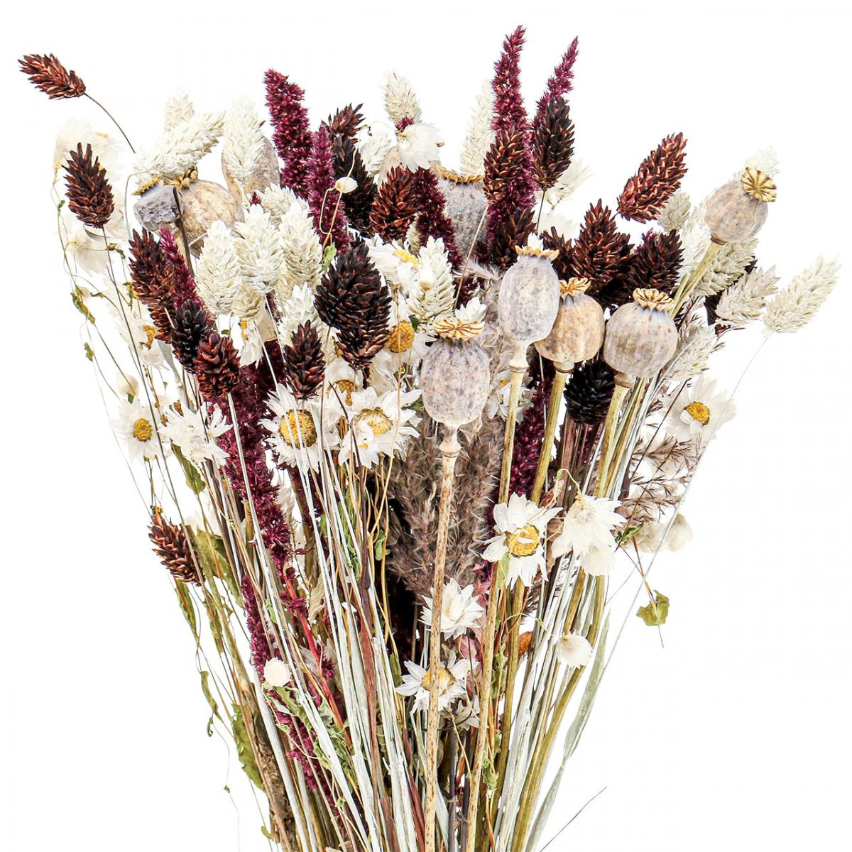 Mit Amarant, kleinen Mohnkapseln, weißem und schokoladenbraunem Phalaris, Süßgras und weißen Strohblumen bietet dieser Trockenblumenstrauß ein abwechslungsreiches Bild. Alle Bestandteile dieses Straußes sind schonend getrocknet und nur der Phalaris gefärbt. Die Komposition aus Trockenblumen und Gräsern lässt sich gleich in der Vase aufstellen!