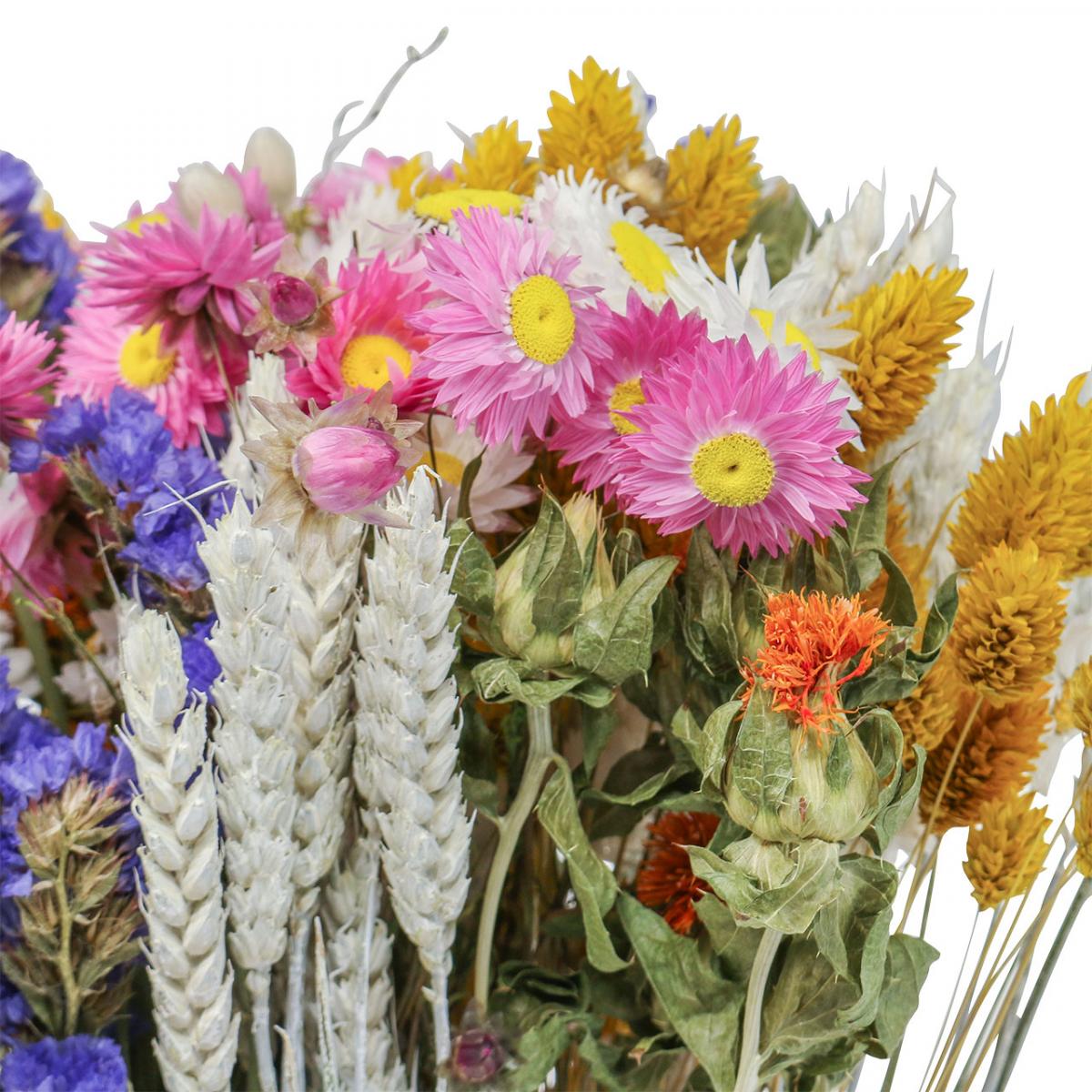 Dieser bunte Trockenblumenstrauß ist eine wahre Freude! Aus Strohblumen in Weiß, Rosa und Pink, violettem Strandflieder, Phalaris in Gelb und Getreide gebunden, ist er ein Feuerwerk an Trockenblumen-Deko!Der sehr harmonische Trockenblumenstrauß im Boho-Stil kann direkt als Blumendeko für Ihren Tischschmuck eingesetzt werden. Stellen Sie den Trockenblumenstrauß aus Wildblumen und Stängeln Weizen-Ähren in eine große Vase, schon haben Sie eine schöne Trockenblumen-Floristik für Tisch, Festtafel oder Anrichte!