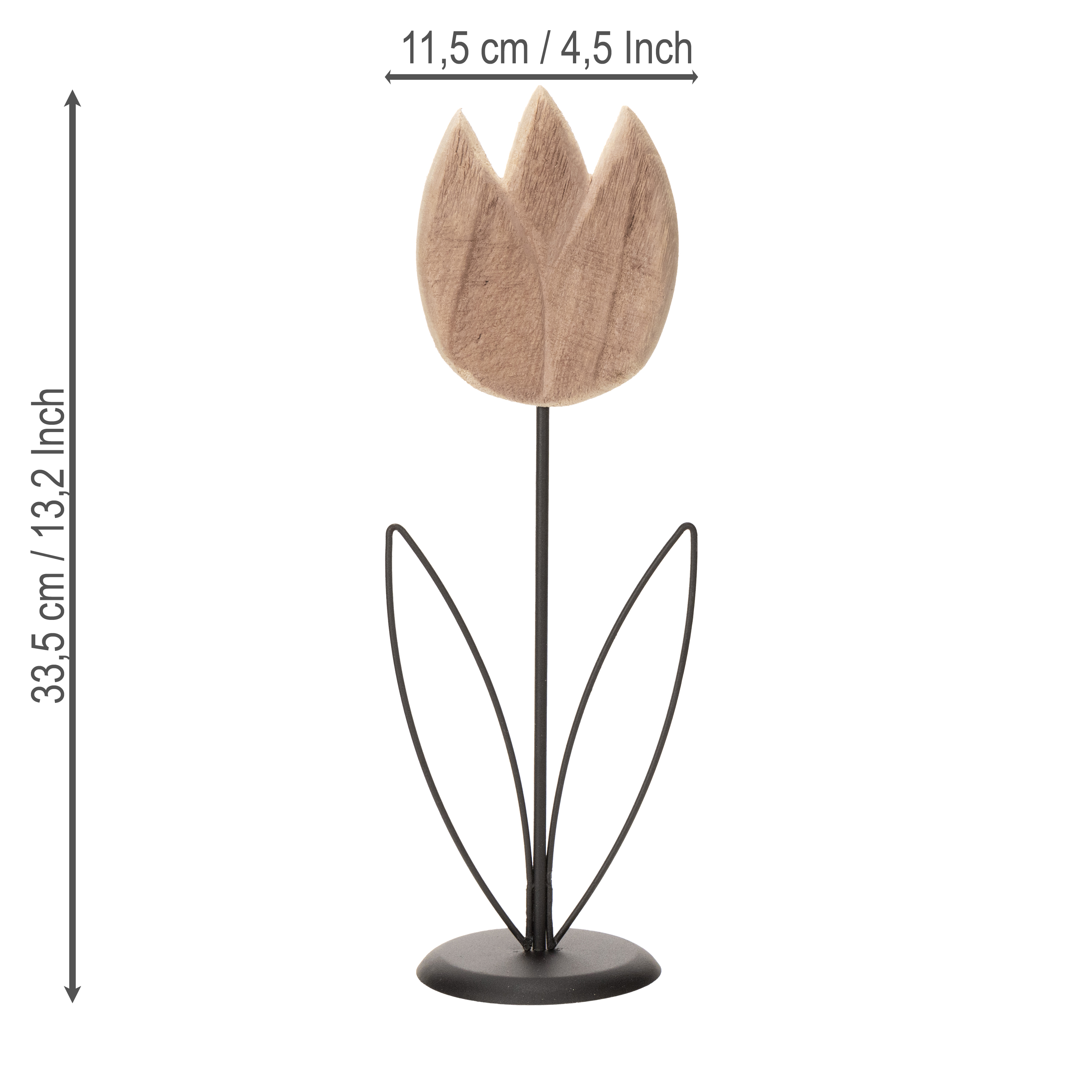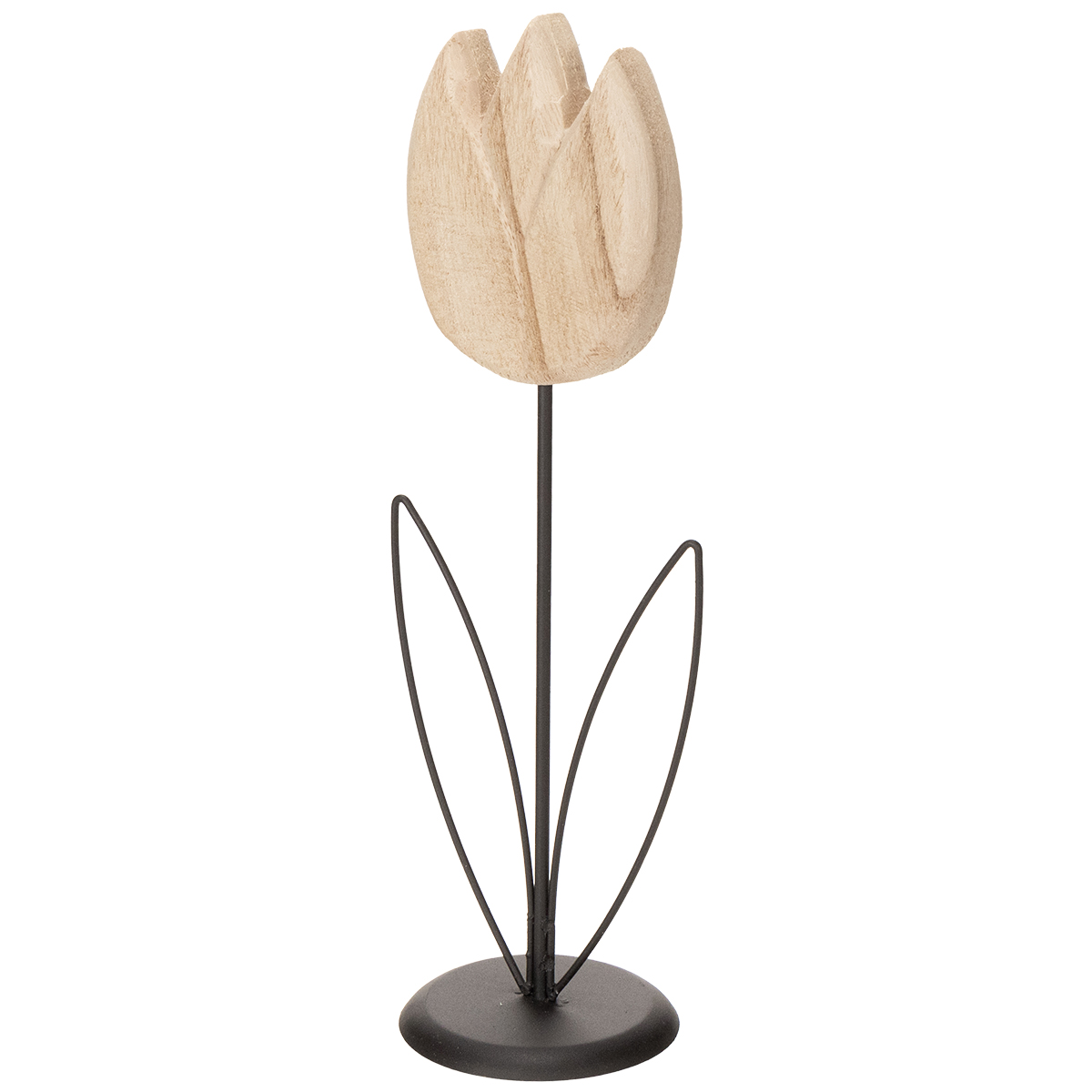 Dieses Tulpen Dekoobjekt zeichnet sich durch seine schlichte, aber dennoch ausdrucksstarke Gestaltung aus. Der tulpenförmige Kopf ist aus hochwertigem Holz gefertigt, das mit seiner natürlichen Maserung besonders authentisch wirkt. Blätter, Stiel und Standfuß bestehen aus robustem Metall und sorgen für eine standfeste Platzierung. Egal, ob Sie einen modernen, skandinavischen oder zeitlosen Wohnstil bevorzugen: Diese Deko-Tulpe fügt sich nahtlos in jedes Umfeld ein. Besonders schön wirkt sie in Kombination mit weiteren Dekoartikeln aus Metall oder Holz – zum Beispiel in einem kleinen Arrangement mit Kerzen oder Vasen.