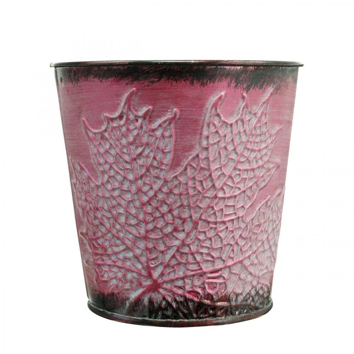 Übertopf mit Blattdeko, Metallgefäß, Herbst, Pflanztopf Weinrot Ø10cm H10cm