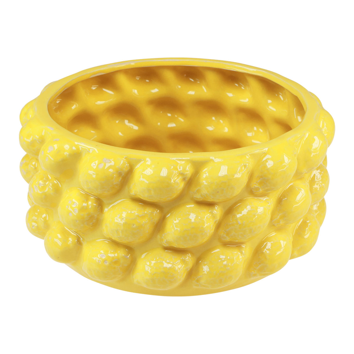 In einem lebhaften Gelb glasiert, inspiriert sich diese besondere Keramikschale an den leuchtenden Farben mediterraner Zitrusfrüchte. Die plastische Gestaltung der Außenseite mit vielen kleinen Zitronen verleiht dem Übertopf eine reizvolle und lebendige Ausstrahlung.