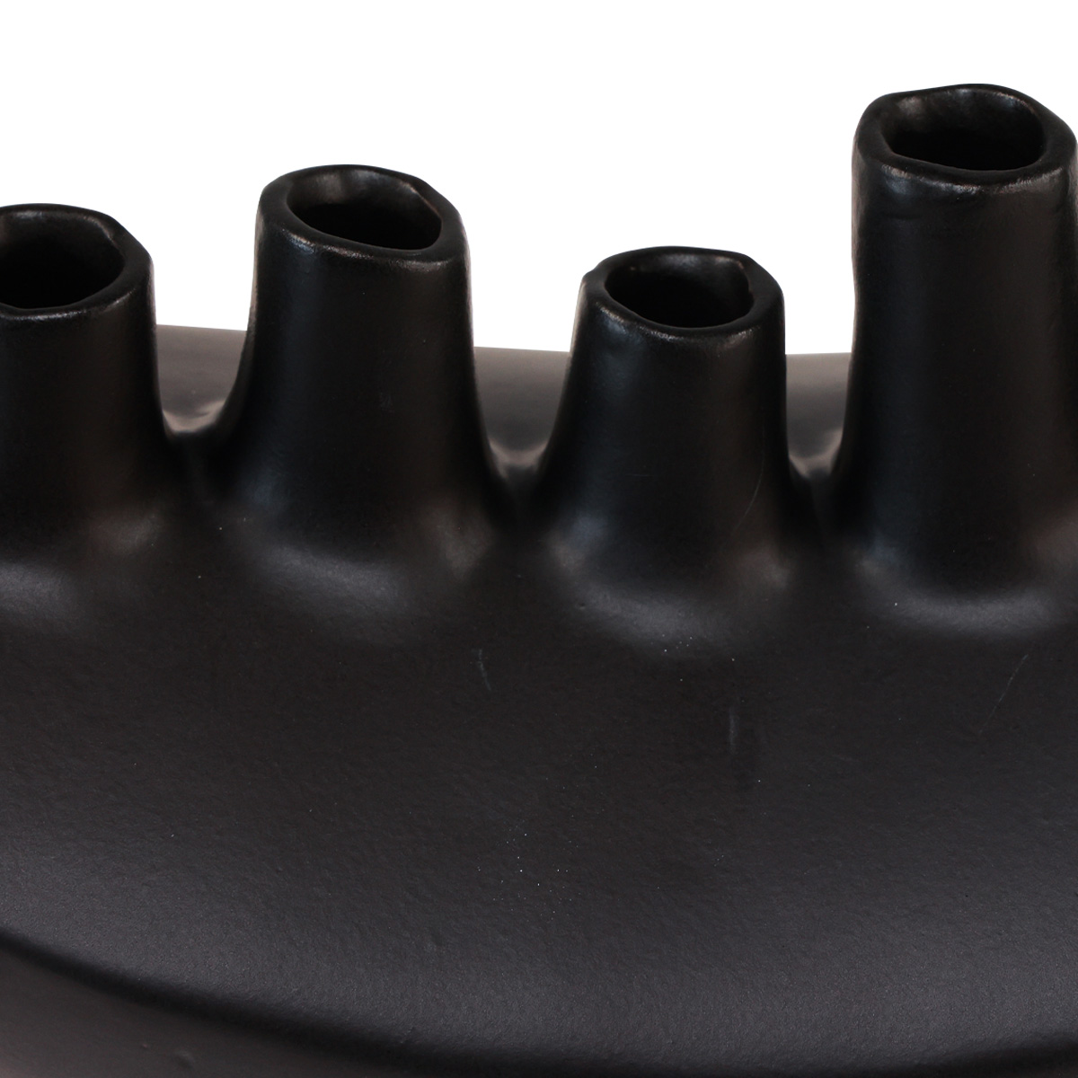 Die Vase besteht aus mattschwarz bemalter Keramik und ist mit insgesamt zehn abstrakten, unterschiedlich hohen Vasenöffnungen versehen. Innen ist das Schiffchen hohl.