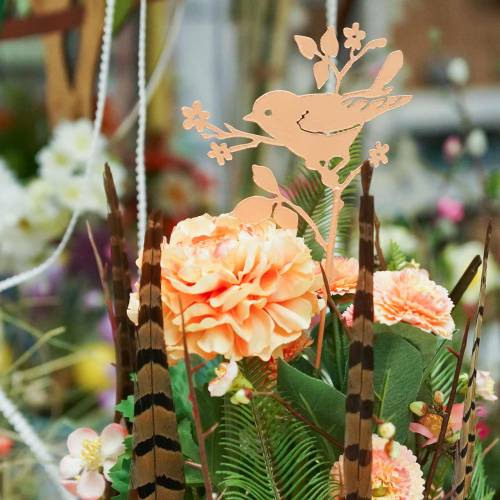 Das romantische Motiv zeigt einen kleinen Singvogel, vielleicht ein Rotkehlchen oder eine Meise, zwischen blühenden Zweigen. Das Design des Blumensteckers von VIANA erinnert dabei an den Jugendstil. So ist das Vögelchen am Pick eine ausgesprochen stilvolle Deko für Ihre Blumengeschenke. Wählen Sie aus den verschiedenen Farben diejenige aus, die am schönsten mit der Farbe der Blüten harmoniert und binden Sie eine kleine Schleife um den Stab. Auch mehrere Dekostecker können Sie ganz einfach in einen Blumenstrauß binden. Natürlich lässt sich der Vogel aus Metall auch in eine Topfpflanze stecken. Oder dekorieren Sie damit einen Blumenkasten auf der Fensterbank!