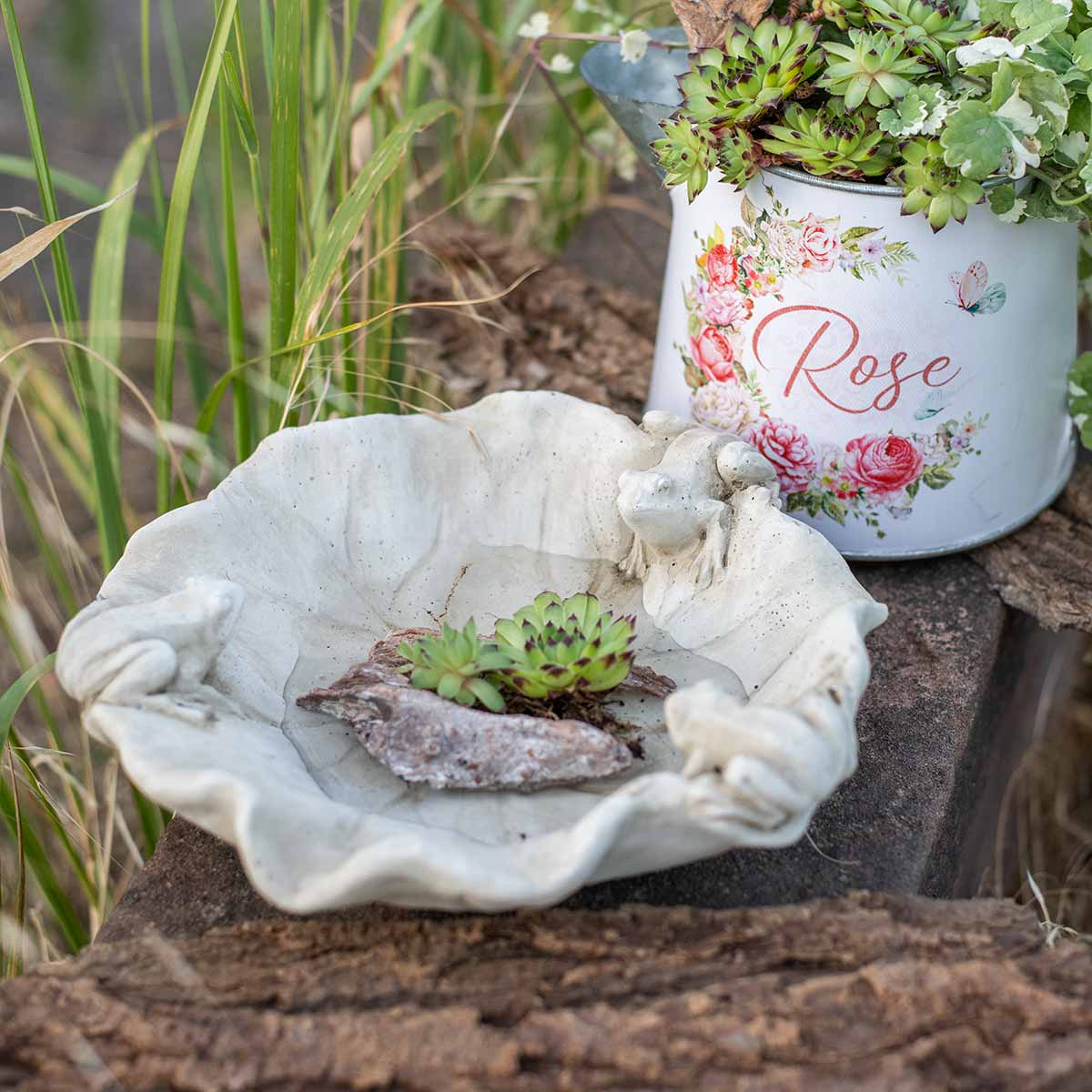 Stellen Sie die Beton-Vogeltränke als Gartendeko am Blumenbeet, auf Ihrer Terrasse oder auch auf dem Balkon auf. Füllen Sie die Betonschale mit sauberem Wasser und schon ist die Wassertränke mit Dekofiguren bereit für alle Vogelfreunde. Fügen Sie gern noch ein paar mittelgroße Steine hinzu, die Sie einfach in die Mitte des Vogelbad in Form eines Lotusblatt mit Frosch legen. Die Steine sollten dabei etwas aus der Wasseroberfläche herausragen. So vorbereitet können auch Bienen, Schmetterlinge und andere Insekten sicher in der Vogeltränke aus Beton landen.