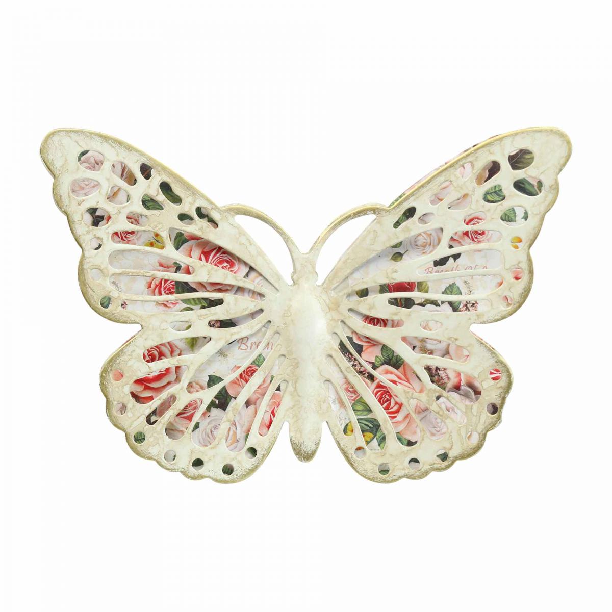Die in den Raum ragenden Flügel des Metall-Schmetterlings sind mit einem typischen Muster durchbrochen und geben dabei den Blick auf eine darunterliegende zweite Ebene der Metalldeko frei. Der untere Teil der Schmetterling-Deko ist mit einem blumigen Motivprint aus Rosenblüten in Gelb und Rosa, kleinen Schmetterlingen und zarten Schriftzügen versehen.