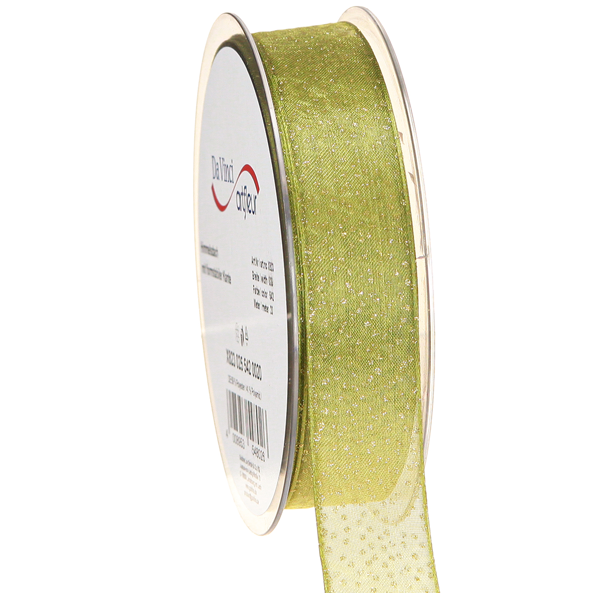 Das hellgrüne Weihnachtsband mit den Glitzerpunkten hat eine Länge von etwa 20 Metern und eine Breite von circa 25 Millimetern. Es besteht zu 59% aus Polyester und zu 41% aus Polyamid. Das Seidenband wird auf einer praktischen Rolle aus recyceltem Kunststoff geliefert.