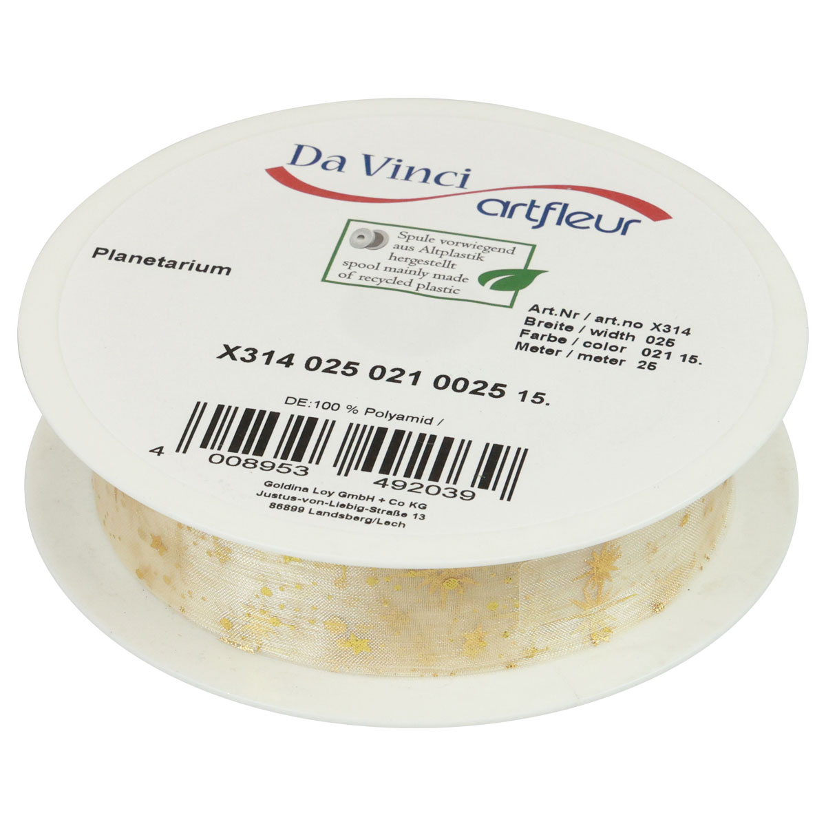 Das Dekoband für Weihnachten aus Organza in Weiß mit goldenen Sternen kommt als Schleifenband mit einer Breite von etwa 25 Millimetern auf einer Spule aus Kunststoff aufgerollt. Die Gesamtlänge des Schleifenbands aus Organza beträgt um die 25 Meter.