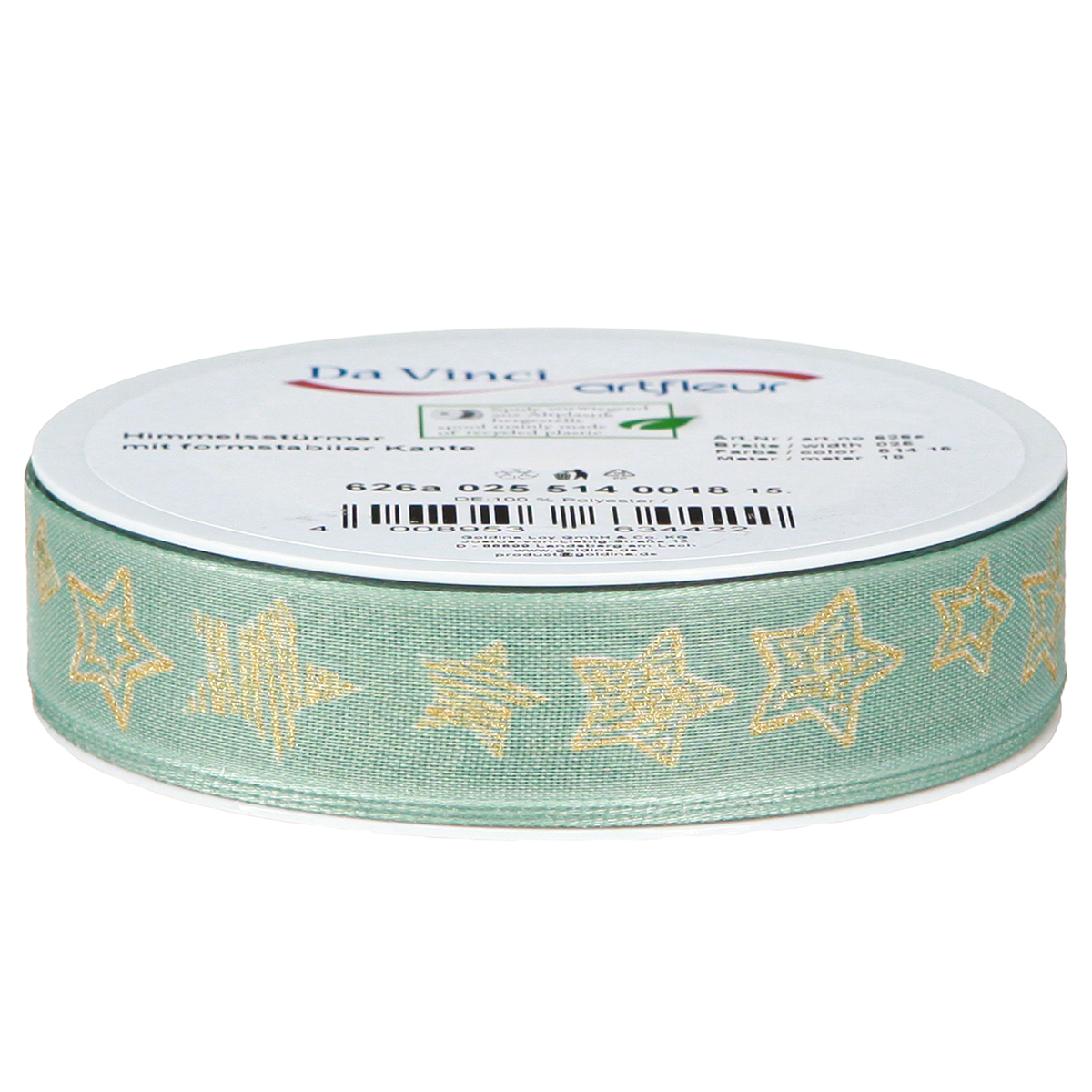 Das Weihnachtsband in Grün mit silbernen Sternen ist sorgfältig verarbeitet und bedruckt und mit einer stabilen Webkante versehen, um sicherzustellen, dass es nicht ausfranst. Mit einer Breite von etwa 25mm und einer großzügigen Länge von circa 18 Metern auf der praktischen Kunststoffspule haben Sie ausreichend Material, um Ihre kreativen Weihnachtsideen umzusetzen!